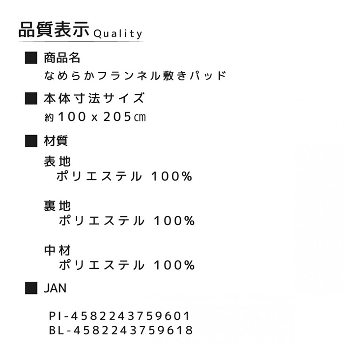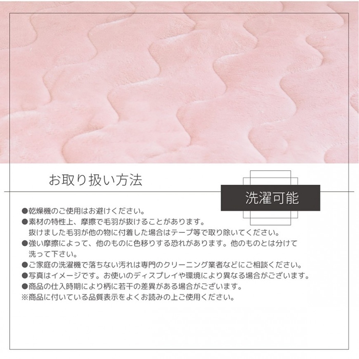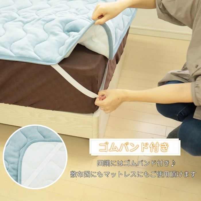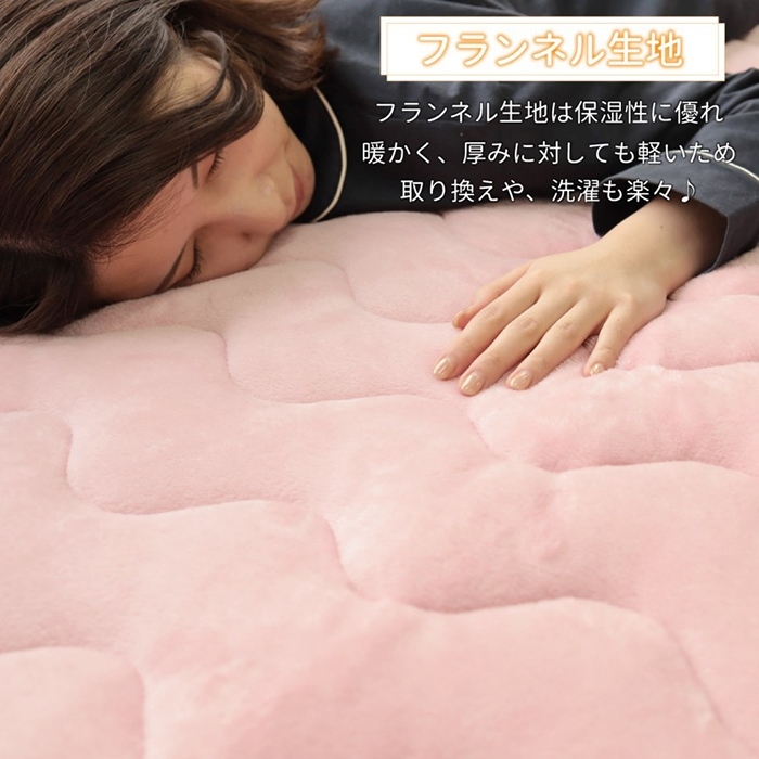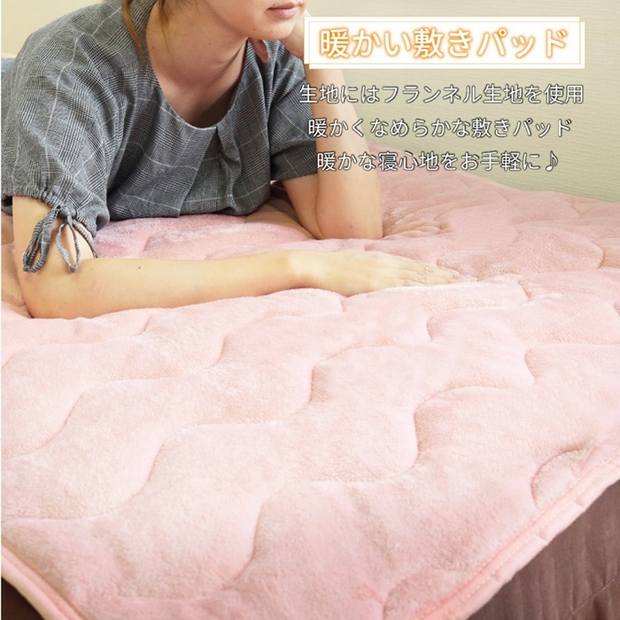 | 生地にはフランネル生地を使用しているため暖かくなめらかな敷きパッド。暖かな寝心地をお手軽に♪ フランネル生地は保温性に優れ、暖かく、厚みに対しても軽いため取り換えや洗濯もラクラク。 カラーバリエーションは2色。お部屋に合わせて好きな色をお選びいただけます。 四隅にはゴムバンド付き。敷布団にもマットレスにもご使用いただけます。 |