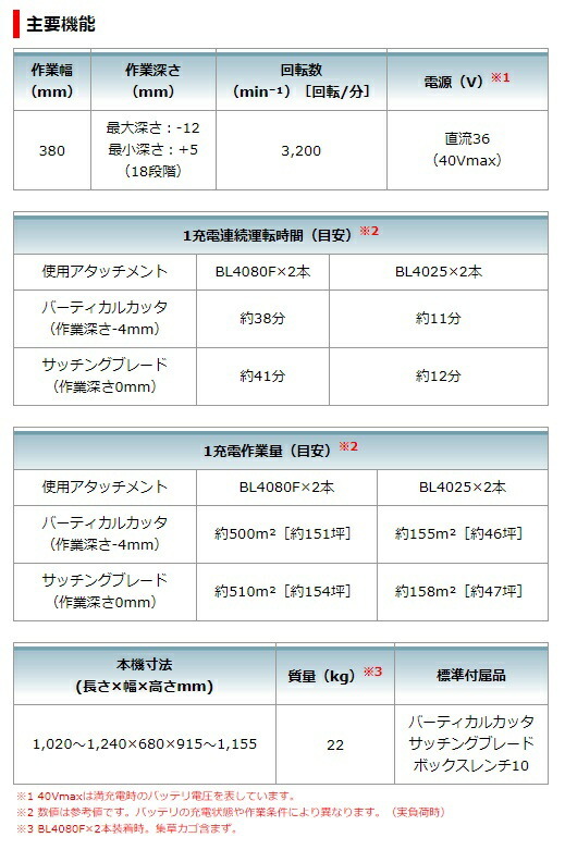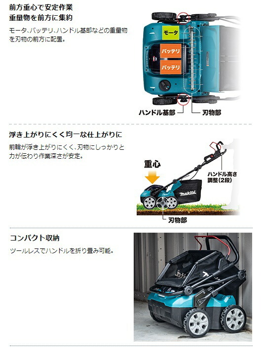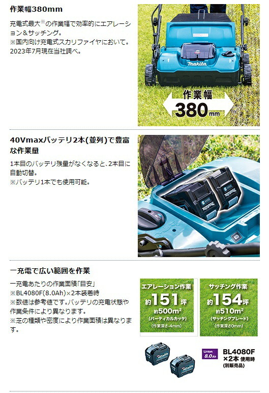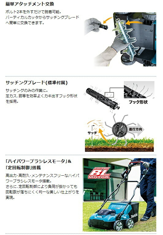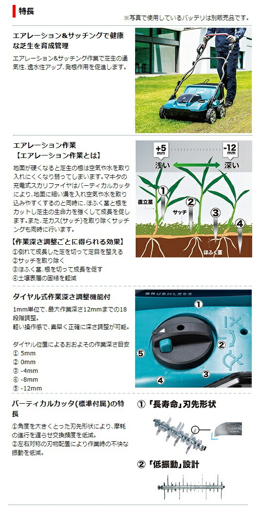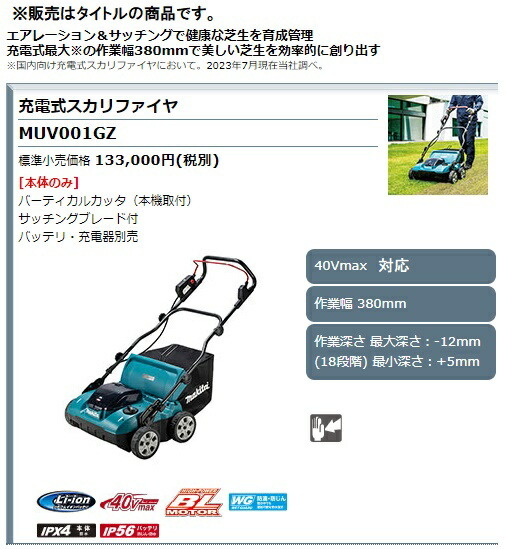 マキタ makita充電式スカリファイヤ MUV001GZ 本体のみです。※バッテリー・充電器は別販売品です。バーティカルカッタ(本機取付)サッチングブレード付197050000521■エアレーション&サッチングで健康な芝生を育成管理エアレーション&サッチング作業で芝生の通気性、透水性アップ、発根作用を促進します。■エアレーション作業■ダイヤル式作業深さ調整機能付■バーティカルカッタ(標準付属)の特長(1)角度を大きくとった刃先形状により、摩耗の進行を遅らせ交換頻度を低減。(2)左右対称の刃物配置により作業時の不快な振動を低減■簡単アタッチメント交換■サッチングブレード(標準付属)■「ハイパワーブラシレスモータ」&「定回転制御」搭載■作業幅380mm■40Vmaxバッテリ2本(並列)で豊富な作業量※バッテリは別販売品です。■前方重心で安定作業重量物を前方に集約■浮き上がりにくく均一な仕上がりに■コンパクト収納■高い防水性能■「大容量50L」集草カゴ■前後同径ホイール付