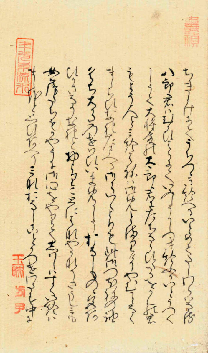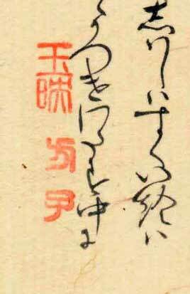 原本自筆上部には、「年光東流水」(年光東流の水)漢文の篆書印が押捺されている。言葉の意味は、「時間の流れは東へと流れる川の水のように止まることなく流れてゆく」です。白楽天の有名な漢詩です。紫式部が「真木柱」を書くに際し、「白楽天・漢詩集」の漢詩を熟読したうえで「源氏物語」の「真木柱の巻」を書いていることがわかります。この原詩の言葉の引用は、「真木柱の巻」に用いられていることで広く知られている。紫式部がこの原詩に親しんでいたことがわかる。