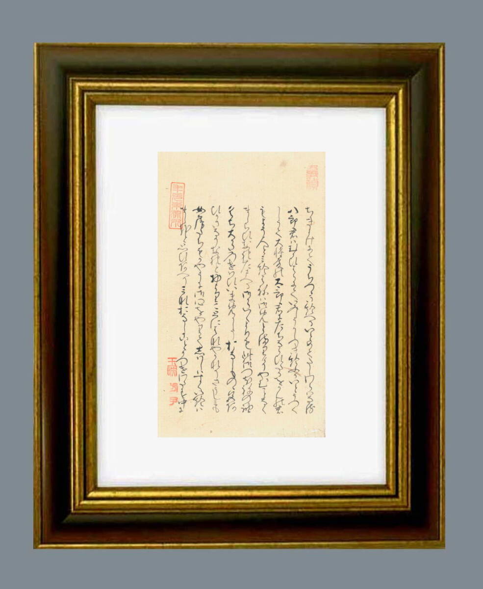 「源氏物語」自筆の大きさ タテ21.8センチ ヨコ12.8センチ。額縁の大きさは タテ37.0センチ ヨコ28.0センチです。額縁は新品です。 |