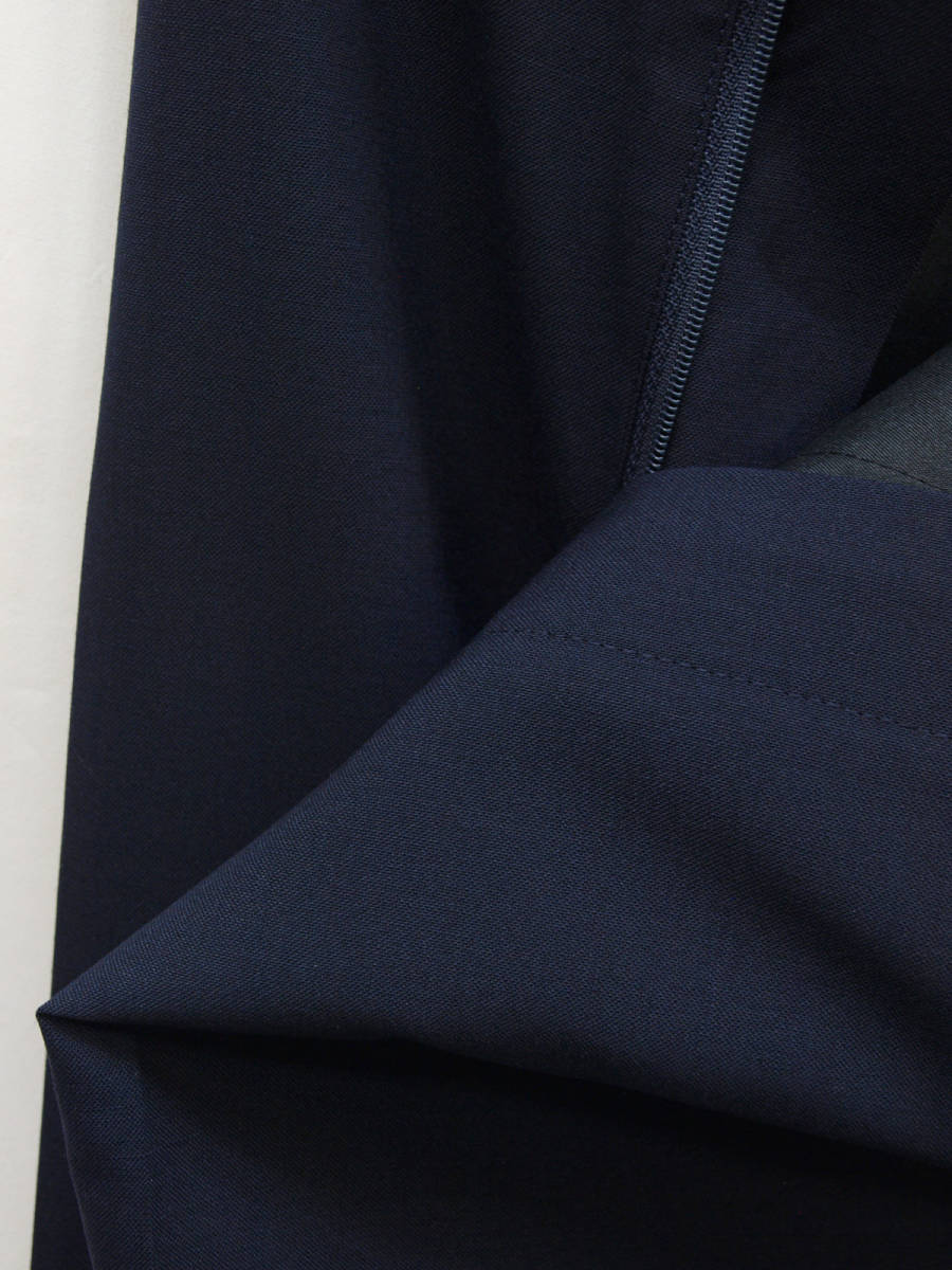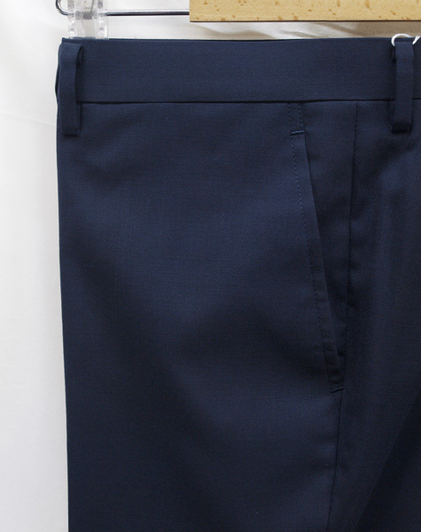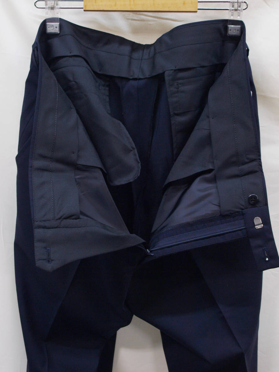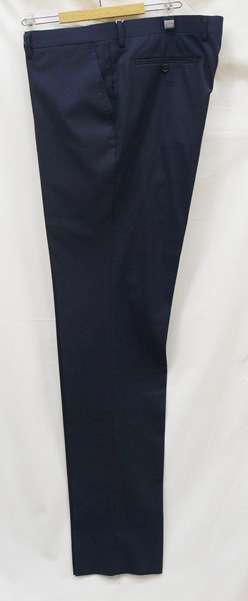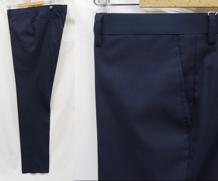【サイズ】 120cm 実寸 120cm わたり幅42cm 股下10cm部分39.5cm 股上(脇計測)29.5cm 前股上33.5cm 裾幅23.5cm 股下91cm(新品・裾上げ未処理の状態) *KBE6号スーツの組下スラックスです。 【デザイン/仕様】 すっきりシルエットのノータックスリム、ビジネスパンツです。 ノータック、ひざ裏地有、斜め付けポケット、前中心ファスナーでボタン&ホック留め、内掛けボタン付き、後ろポケット両玉縁で左のみボタン付き。 【素材】 ウール52% ポリエステル48% 【色/柄】 濃紺無地 ・さらっとした肌触りでやや薄手のウールブレンド素材、紳士スーツに使われている春夏向け生地を使用 春夏メインのシーズン対応商品