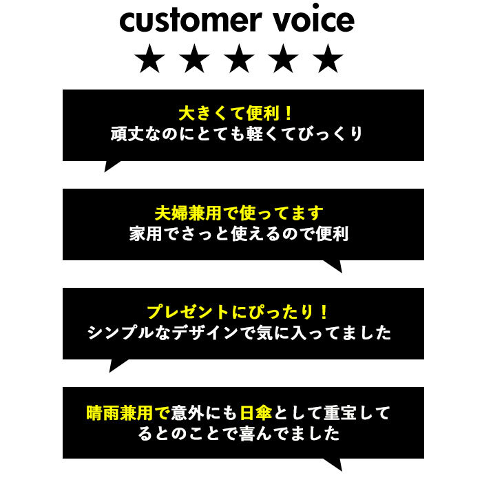 | 商品説明 | ・・「Wpc.」から雨風の強い日でもしっかりカバーしてくれる親骨65cmの長傘が登場。 ・長期的に継続する継続撥水加工とUVカット加工を施した嬉しい晴雨兼用傘。 ・紫外線遮蔽率は淡色の物は約80%、濃色の物は約90%の防止効果。 ・親骨65cmの大きめサイズだから雨や強い日差しからしっかり守ってくれる。 ・傘の持ち手部分は軽量なプラスチック素材を使用。 ・片手でも簡単にワンタッチで開けられるジャンプタイプ。 ・留め具の面ファスナーは幅広タイプで留めやすいのもうれしい。 ・男女兼用のおしゃれなユニセックスデザイン♪大きいサイズだから男性へのプレゼントにもおすすめ。 |