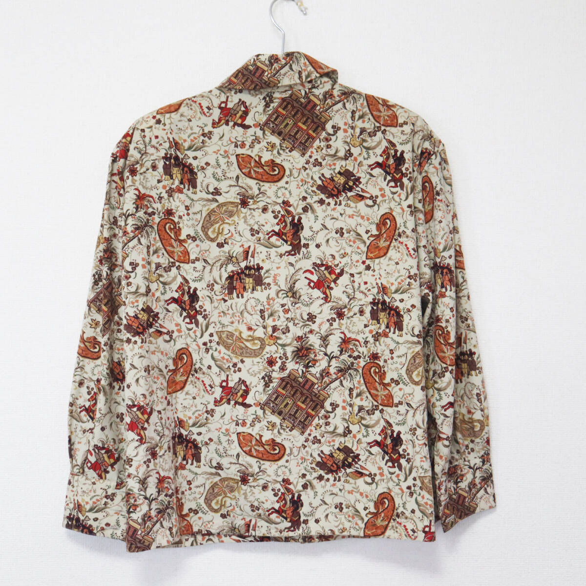 総柄 襟の形が面白いです。 胸幅48 肩幅44 袖丈50 着丈58 ポリエステル100 肩パットは軽く縫い付け。 必要のない方は、取り外してください。 ※画像の色にムラがありますが、画像2・4の襟・袖口の色が 一番実物に近いです。 |
