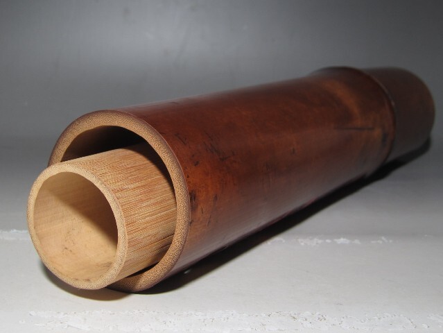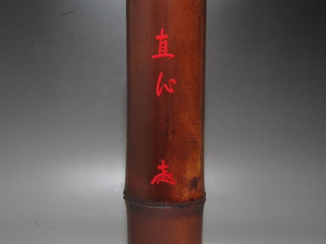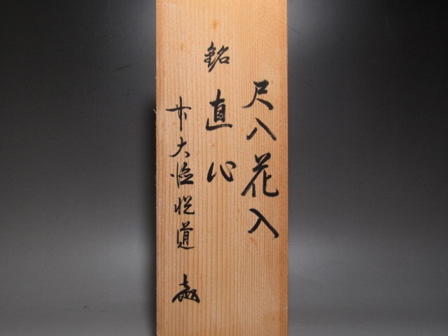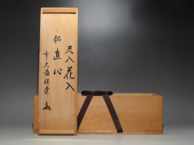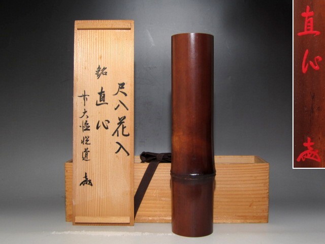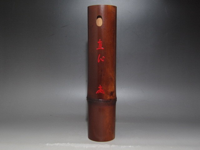 竹尺八花入「直心」です。 趣ある品です。 大徳寺高橋悦道の花押があります。 サイズ 直径6.5cm/高さ27cm(多少の誤差はお許しください) 状態 一見して疵やヒビ・直しは見られません。 骨董品という事をご勘案頂き、時代経過のスレや、小さな傷がある場合があるかもしれませんのでご承知置きください。 | |||