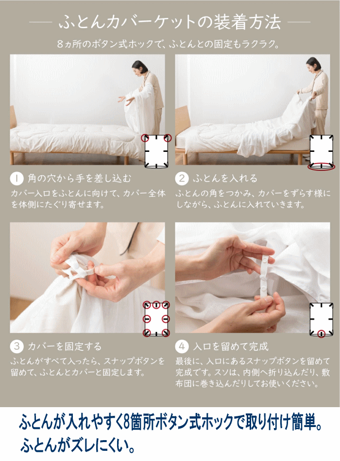 ズレ防止の8ヶ所ボタン式ホック仕様