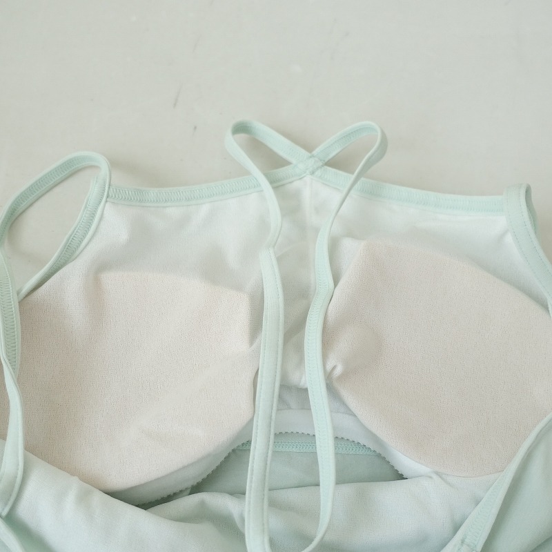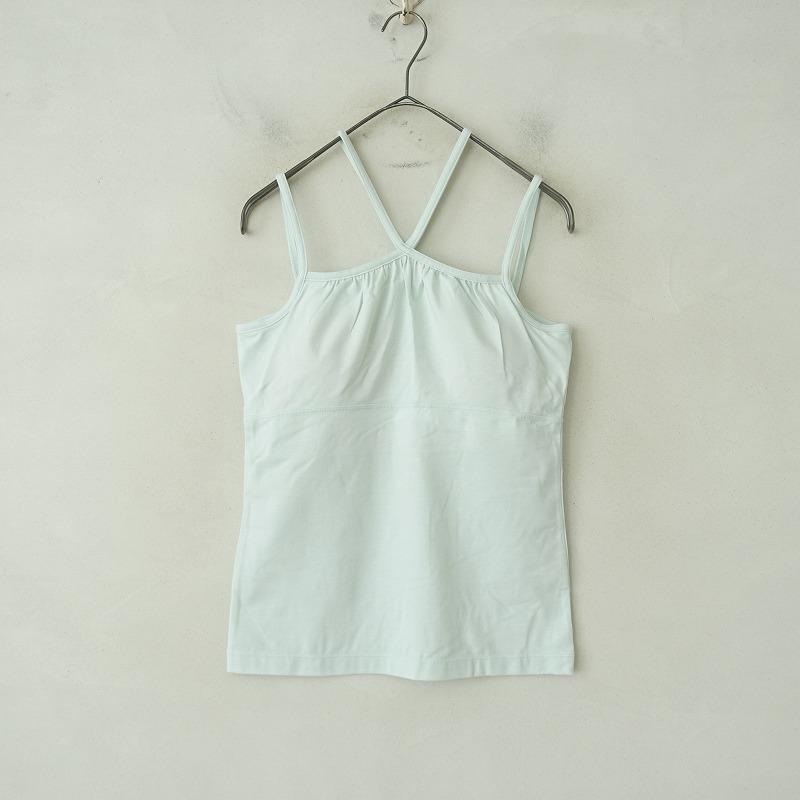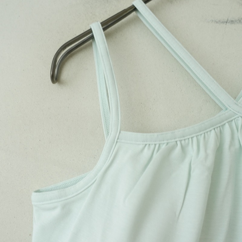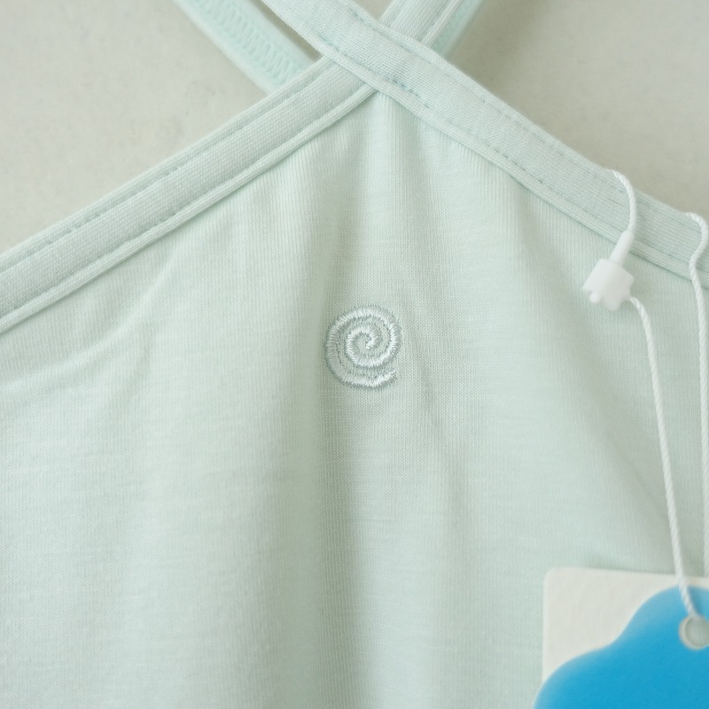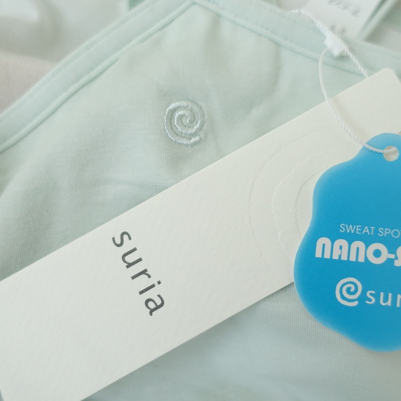 | suriaのイクシーキャミソールです。カラーはミントでナノシア加工により給水速乾性に優れ、汗染みを目立ちにくい素材で仕立てられております。インナーブラが付いており、背中央にワンポイント刺繍があしらわれております。 |