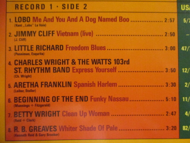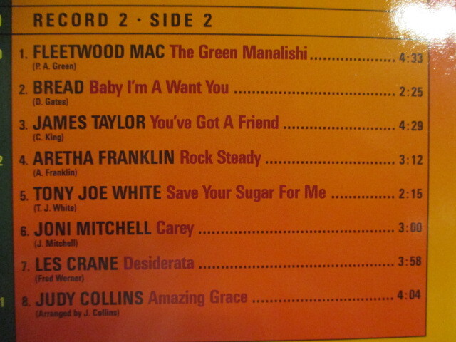 | [盤・状態]EX- [ジャケット・状態]EX [種類]EU/2LP [備考]70年と71年のRock、Soul ヒット! / The Doors / Joni Mitchell / Beginning Of The End / Fleetwood Mac 他 A1Stephen Stills - Love The One You're With3:03 A2Delaney & Bonnie - Never Ending Song Of Love3:20 A3The Doors - Love Her Madly3:17 A4Alice Cooper - I'm Eighteen2:55 A5Fanny - Charrity Ball2:29 A6Jonathan Edwards - Sunshine2:16 A7Graham Nash - Chicago2:55 A8Joni Mitchell - Big Yellow Taxi2:15 B1Lobo - Me And You And A Dog Named Boo2:57 B2Jimmy Cliff - Vietnam (Live)2:50 B3Little Richard - Freedom Blues3:00 B4Charles Wright & The Watts 103rd St Rhythm Band - Express Youself3:50 B5Aretha Franklin - Spanish Harlem3:30 B6Beginning Of The End - Funky Nassau5:10 B7Betty Wright - Clean Up Woman2:47 B8R.B. Greaves - Whiter Shade Of Pale3:20 C1J. Geils Band - Looking For A Love3:45 C2Delaney & Bonnie - Only You Know And I Know3:24 C3The Doors - Riders On The Storm7:14 C4James Taylor - Fire And Rain3:20 C5Lobo - She Didn't Do Magic2:52 C6Lulu - Hum A Song (From Your Heart)2:40 C7Jimmy Cliff - Wild World (Live)4:01 C8Earth, Wind & Fire - Love Is Live5:04 D1Fleetwood Mac - The Green Manalishi4:32 D2Bread - Baby I'm A Want You2:25 D3James Taylor - You've Got A Friend4:29 D4Aretha Franklin - Rock Steady3:12 D5Tony Joe White - Save Your Sugar For Me2:15 D6Joni MItchell - Carey3:00 D7Les Crane - Desiderata3:58 D8Judy Collins - Amazing Graze4:04 | ||