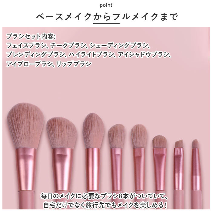 | 商品説明 | ・・持ち運びに便利で可愛いメイクブラシ&収納ケースセットが登場! ・【ベースメイクからフルメイクまで】 ・毎日のメイクに必要なブラシ8本がついていて、自宅だけでなく旅行先でもメイクを楽しめる! ・【柔らかい毛先】 ・ブラシの毛先は柔らかな素材なのでチクチクしたイヤな感覚ナシ!デリケートなお肌も安心して使える。 ・【携帯に便利なポーチ入り】 ・Aタイプにはスナップボタンがついたポーチ付き、ばらばらになりがちなブラシをすっきり収納!持ち運びに便利◎ ・【ブラシを立てたまま使える筒形ケース】 ・Bタイプは外出先でメイクをしっかりとする際に、ふたを取ると使いたいブラシが一目でわかり取り出しやすい!立てたまま使えるのも嬉しい♪ ・【ちょっとした贈り物に】 ・お好みのものを選んで自分用だけでなく、お友達へのちょっとしたプレゼントなどにぴったり! ・【ブラシセット内容】 ・フェイスブラシ、チークブラシ、シェーディングブラシ、ブレンディングブラシ、ハイライトブラシ、アイシャドウブラシ、アイブローブラシ、リップブラシ |