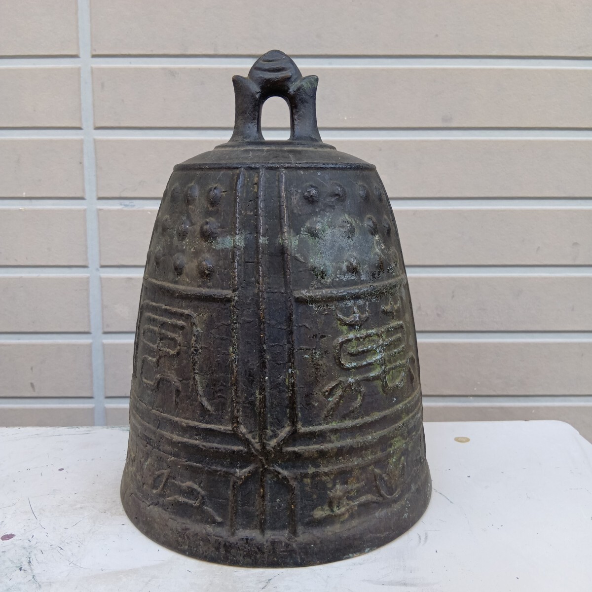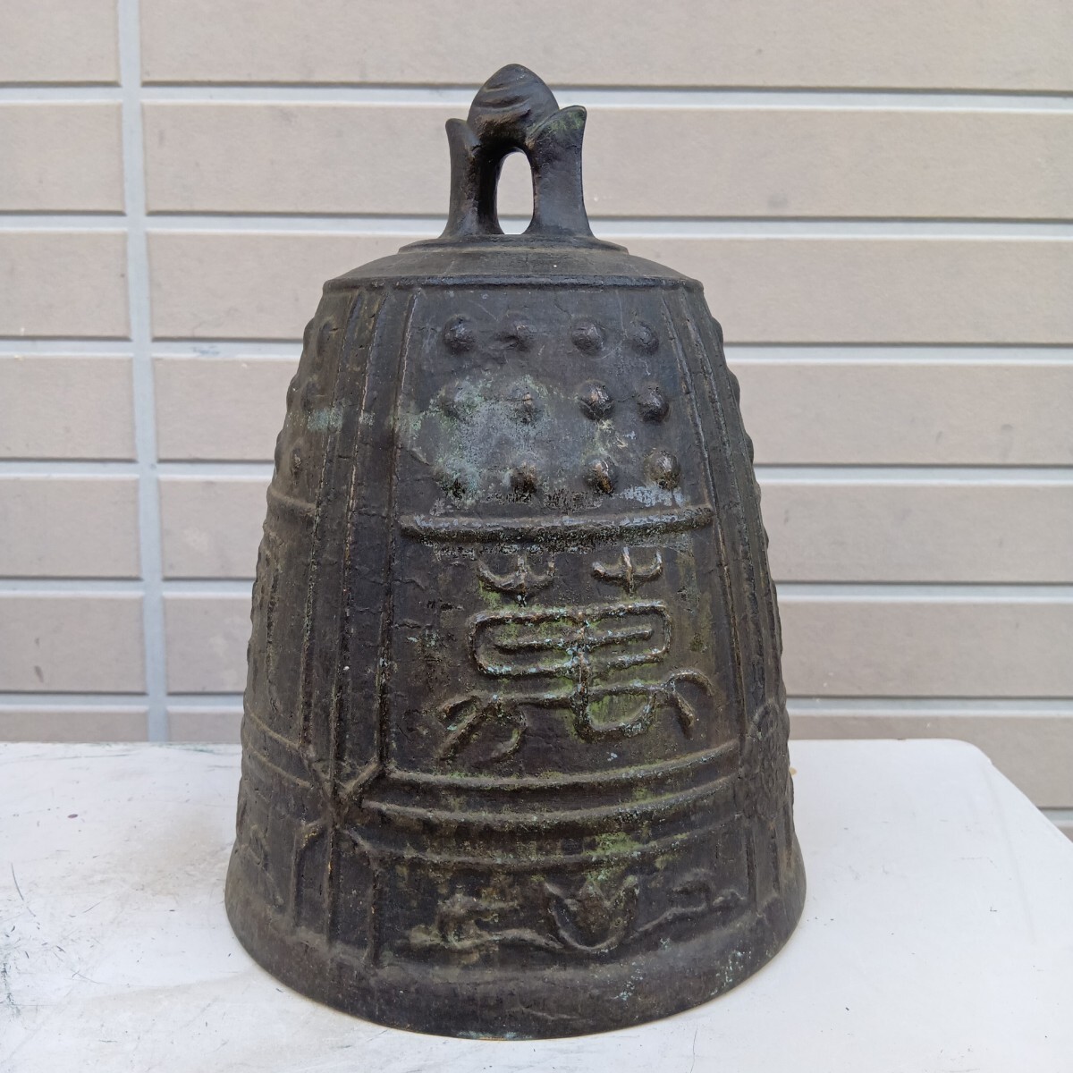 釣鐘 唐金 真鍮製 時代物 旧家蔵出し品 青錆有 現状品 高さ約23cm 胴径約17cm 大型 重さ2.1kg 古い為青錆有 良く画像をご覧頂き入札をお考え下さい。