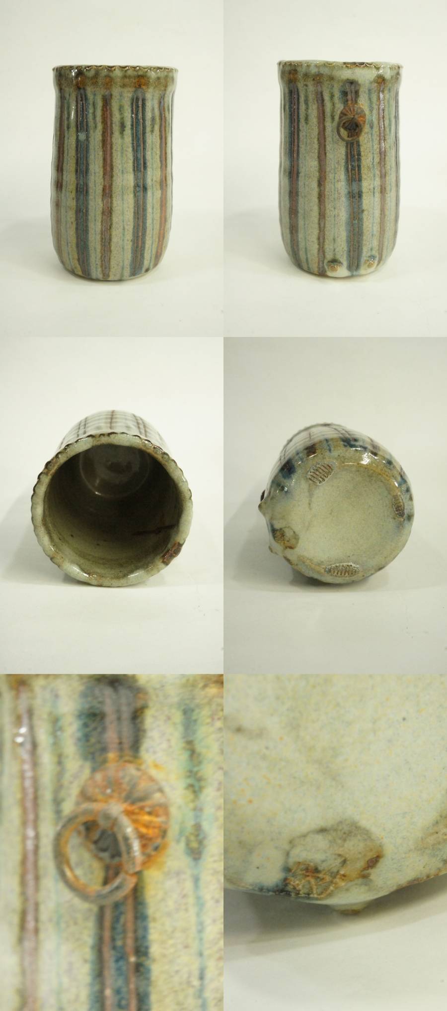 本体/掛花入の金具にサビが生じています。おまけの浅野陽作のビアカップは使い込まれて、変色しています。
