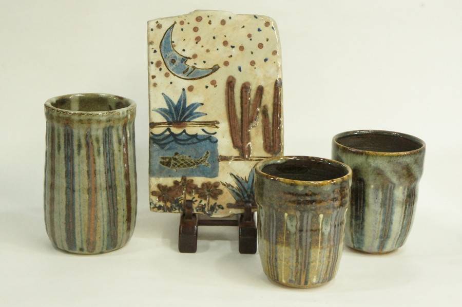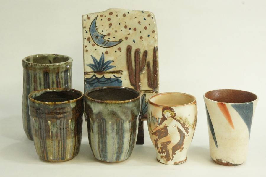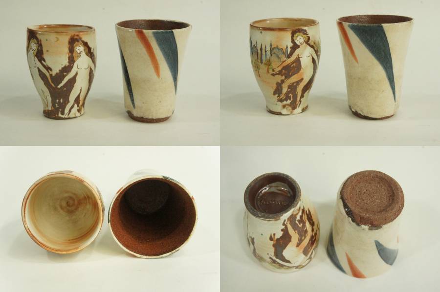 東京藝術大学OBの陶芸家・深谷泰のビアカップ2・掛花入1・陶板1の計4点セットと