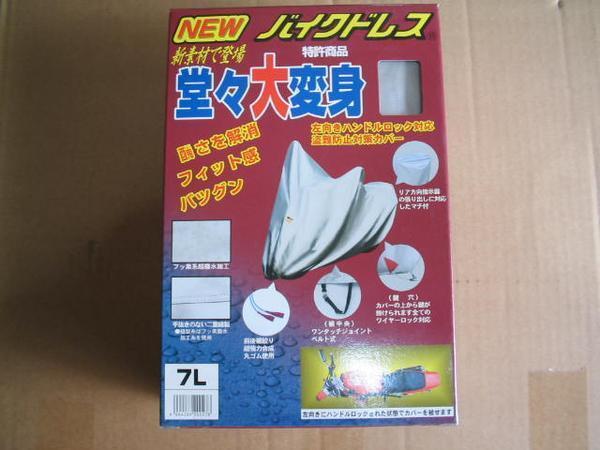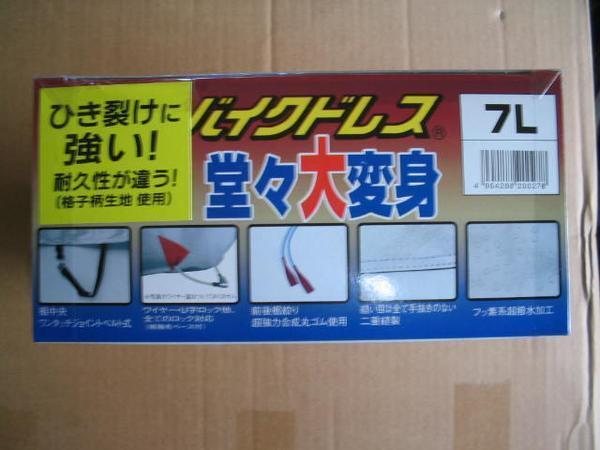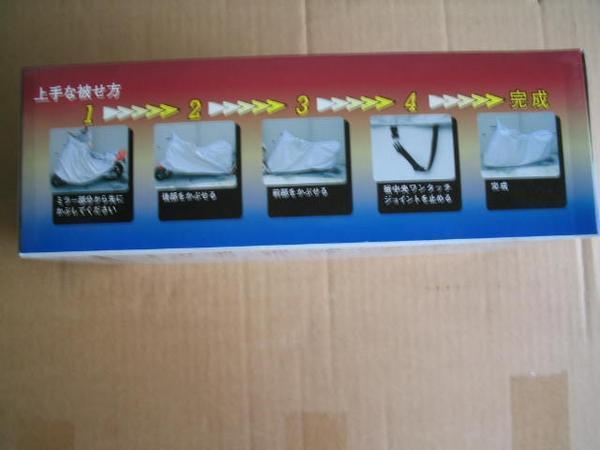 商品説明 新品未使用 バイクカバーです。 ヤマハ・ホンダ・スズキ・カワサキ国内4メーカー以外の車両にもご使用頂けます。 サイズ: バイクカバービッグスクーター用 7L 定価: 10400円 数量: 1 【特徴】 のぞかれにくい深いかぶりとスソ絞り。 前後裾絞り 合成丸ゴム使用 裾中央 ワンタッチジョイントベルト式 鍵穴 カバーの 上から 鍵が かけられます ハンドルロック状態(左側)に合わせた立体裁断。(バイクの種類形状に合わせたサイズ設定) 風を巻き込みにくいスソ絞りタイプ。 フッ素系撥水加工で雨が染み込みにくい。 縫い目は全て二重縫製、丈夫で耐久性に優れています。 紫外線、潮風、酸性雨に強い。 素材、縫製とも全て国内製造。 【使用生地】 高強度極細高密度織物に特殊高級溶剤アクリル樹脂配合フッ素系撥水ハードコートポリエステル100% 【サイズ別適応表】 ●S サイズ 小型スクーター(前カゴ可) ヤマハ: ジョグ ・ ビーノ ・ アプリオ ・ ポシェ ・ ホンダ: ディオ ・ ジョルノ ・ リトルカブ ・ ツデイ ・スクーピー スズキ: レッツ ・ ヴェルデ ・ ・ ZZ ・ チョイノリ ・ モレ ---------------------------------------------------------------------------------------------- ●M サイズ ビジネス(前カゴ可) ・ ミニスポーツ ヤマハ: メイト(各シリーズ)・ TZM50 ・ YB-1 ・ RZ50 ホンダ:NSR50/80 リトルカブ ・ エイプ ・ダックス50・ バイト・カブ(各シリーズ)・ スズキ: ストリートマジック ・K50・コレダ・バーディー(各シリーズ)・GS50 Lサイズ 中型スクーター(前カゴ可)・ ビジネス(前カゴ可) ・ ミニスポーツ ヤマハ: アクシス50/90 ・ギア ・ グランドアクシス100 ・ ビーウィズ50/100 ・ シグナス125 ・ VOX ホンダ: リード50/100・スペイシー125・ズーマー・NS-1・ドリーム50・マグナ50・XRモタード50/100 スズキ: ストリートマジック アドレス50/100/110 カワサキ:KSR50---------------------------------------------------------------------------------------------- ●2L サイズ 小、中型ネイキッド・小型オフロード ヤマハ: R1-Z・SRV・ルネッサ250 ホンダ: ホーネット250・FTR・VTR250・GB400SS・GB250・NSR125/250・RVF スズキ: バンディット250・SV400・グース・テンプター・グラストラッカー・ボルティ・GSX250FX ・ ヴェクスター125/150・アベニス150 カワサキ: バリオス ・ エストレア ・ スーパーシェルパ ・ 250TR エプシロン150 ------------------------------------------------------------------------------------------------ ●3 L サイズ 大型ネイキッド・小型アメリカン ・ 中型オフロード ヤマハ: XJR400 . SR400/500・ SRX400/600・XT250X.TW200/255・セロー225. ランツァ・ DT125/250 ・ セロー250 ホンダ: SL230・XL230・XR230・CB400SF・CB400SS・ホーネット600・CRM250・XR250・400 スズキ: SV400・イナズマ400/1200・バンディト400・GSXカタナ250/400・SV650/1000 イントルーダー250・DR250/400/650・ジェベル200/250・250SB・バンバン200 カワサキ: ZRX400・ゼファー400・ZR-7・Z1000・エリミネーター125/250 W650・Dトラッカー・KLX250/400・KDX124/220/250・KLR650・ZZ-R250 ------------------------------------------------------------------------------------------------ ●4L ビッグバイク用 ネイキッド アメリカン ヤマハ:XJR1200/1300 .TDM850/900 ・ ドラックスター250/400 ・MT01. TDM850/900 ・ FJR1300・ FZS600/1000・YZF R/R6/R7 ・YZF600R/1000R・TRX850・TMAX ホンダ :V-ツインマグナ・CB1300・X-11・X-4・CBR600/1000/1100・ホーネット900・VTR1000SP/F・RVF・ ・CBR600Fファイヤーストーム・スティードVLX スズキ: ハヤブサ・GSF1200SS・バンディト1200・GSX-R600/750/1000・GSXカタナ1100・TL1000S/R・バンデット12500S・SV-S・GSF600/750/1200 カワサキ: バルカン400/800 ・ZRX1200・ゼファー1100・ZX6R/9R/10R/12R・ZZ-R1200・GPZ900/1100・ZX1200S・ZR-7S・ZRX250/400・Z750S -------------------------------------------------------------------------------------------------5L ビッグバイク用 ビッグアメリカン ドラッグスタークラシック(400-1100)XV1700ロードスター VTR1800 シャドウ400/750 イントルーダークラシック400/800/1500 バルカンクラシック400/900/1500 バルカンドリフター 6L ビッグカウルミラー FJR1300 YZF(R1/R6/R7)TRX850 CBR(600/654/1000)CBR1100XX VFR800 VTR1000F CBR600F ホーネット600S NR750 CBF600/1000 CB400 CB1300 GSX1300R バンデッド1200S GSX600/750/1000S SV400/650/1000 TL1000 ZRX1200S GPZ900R ZX(6/7/10/12)R ZR-7S ZZR400/600/1200/1400 Z750S ●7Lビッグスクーター サイズ 大型スクーター(風防付き) ヤマハ : マジェスティ・グランドマジェスティ ホンダ : フォツツァ ・ フォーサイト ・ PS-250 スズキ : スカイウエイブ250/400 カワサキ : エプシロン250 --------------------------------- ノークレーム ノーリターンです。ゆうパック元払いで送ります。入札前に自己紹介欄を読んでください。