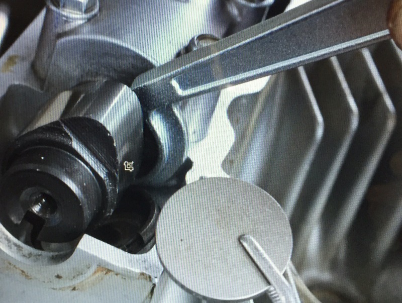 ・クリアランスが設定範囲外のときには、専用工具先端からR部分のエサイドッジをタペット外周に引っ掛けながら、テコの利用でタペットを押し下げる。このときにカムホルダー側壁で工具のズレを防止する。