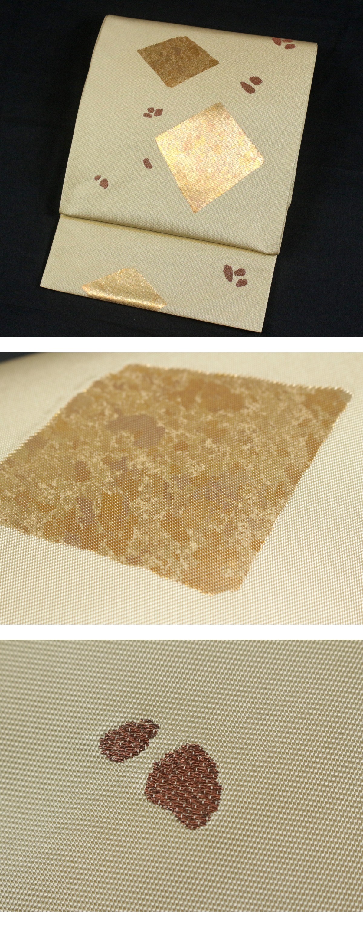 格式と美を誇る西陣の名門「川島織物」謹製、正絹袋帯のご紹介です。 しっとりとした光沢を湛える地に、金箔をあしらった菱形文様が品よく配され、洗練された印象を漂わせ、光の加減によって奥行きある輝きを放ちます。 周囲には織りによる小さな文様が添えられ、シンプルながらも職人技の確かな手仕事が感じられる意匠。 無駄のない構成美と柔らかな配色が調和し、合わせる着物を選ばない万能の一本でございます。 訪問着や附下、色無地などの装いに上品な華を添えてくれることでしょう。 格調の中にもモダンな感性が息づく、川島織物ならではの逸品。品格ある装いをお楽しみください。 ※撮影時の部屋の照明によって画像の色に若干の差がございます。色味に差がございますことをご了承のうえご検討下さいませ。 …状態… 僅かな締め跡あり。 ※全くの新品ではございませんので、記載のない変色やスレ、ヤケ、その他僅かな難がある場合がございます。そのような理由でのキャンセルはお受けできませんので、ご了承の上ご検討お願いいたします。 |