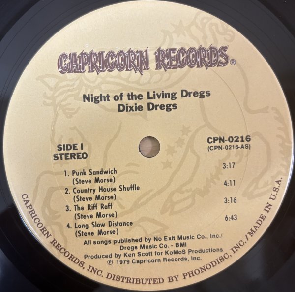 【 収録曲 】 A1. Punk Sandwich (3:14) A2. Country House Shuffle (4:12) A3. The Riff Raff (3:16) A4. Long Slow Distance (6:32) B1. Night Of The Living Dregs (Live *) (4:18) B2. The Bash (Live *) (4:29) B3. Leprechaun Promenade (Live *) (3:47) B4. Patchwork (Live *) (4:46) * Recorded at the Montreux Jazz Festival, July 23, 1978 Total Time: 34:38 【 Line-up / Musicians 】 - Steve Morse / guitars - Mark Parrish / keyboards - Allen Sloan / strings - Andy West / bass - Rod Morgenstein / percussion ※本作までがCapricornからの作品であり、前作同様ケン・スコットがプロデュースとエンジニアを担当している。①~④がスタジオ録音、⑤~⑧がスイス、モントルーでのライヴ録音という変則的なアルバムだが、何しろ滅茶苦茶にテクニックのあるバンドなので、ライヴも余裕たっぷりだ。後年スティーヴ・モーズのことばかりで語られている彼らだが、アレン・スローンのヴァイオリン・プレイも大きな位置を占めていた。周辺にジェフ・バーリンやスコット・ヘンダーソンらがいること、また、後のWindham Hillとも連鎖していることなどは覚えておいた方がいい。 ( アメリカン・ロック集成より抜粋 ) 【 参考音源 】 Night Of The Living Dregs Dixie Dregs |