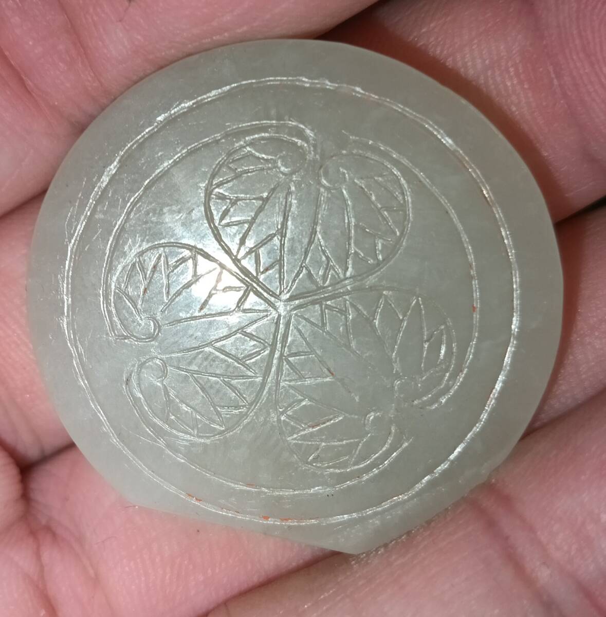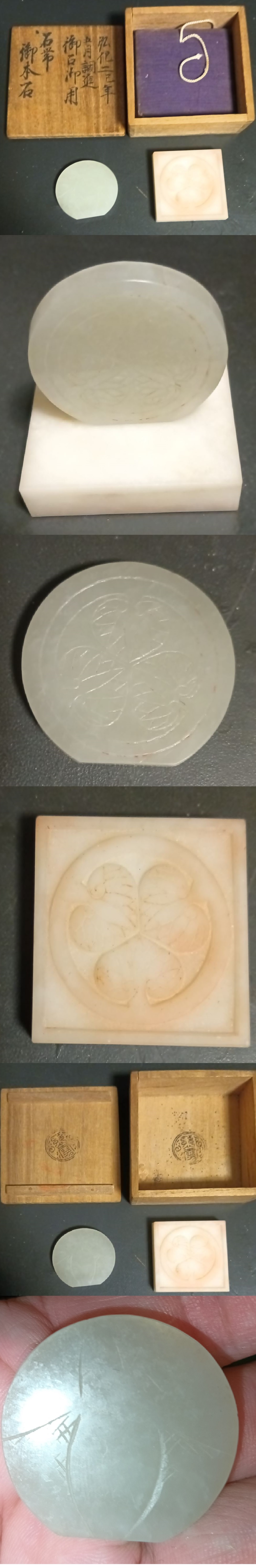 弘化2年(1844年) 徳川家 御石御用 和田玉 白玉 玉石 徳川家 家紋 三つ葉葵 石彫刻 文房具 書道具 台座付 箱付 中国美術 古物 唐物