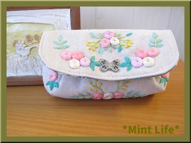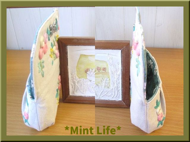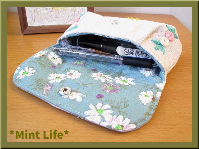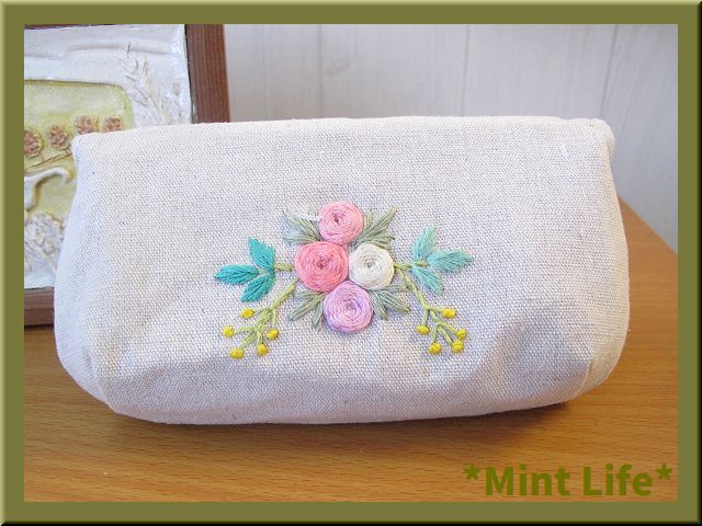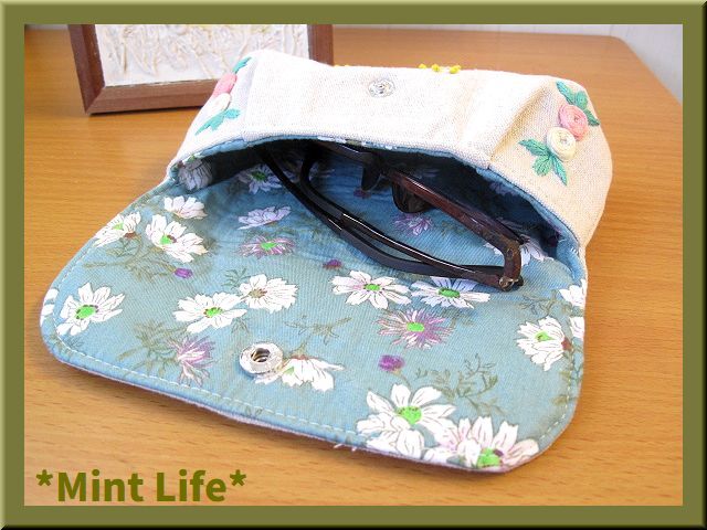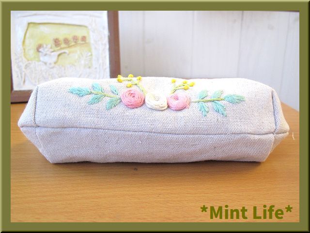 | *Mint Life* ハンドメイド 「リネンポーチ」メガネ兼ペンケース 手刺しゅう | ||||