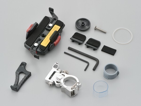 スマホ密着座面を確保するためボディ上側を約12mm延長(箕浦STDボディ高=90mm)。ロングセンターパッド、片手で操作しやすい小型解除ノブ、首振りクランプ標準装備。対応機種寸法目安=幅50~85mm(左右2ノッチ縮めが幅限界目安)、厚さ6~18mm、重さ300g以下。機種に合わせて上下アームとサイドフックの組み合わせを選択し、各々調整固定して使用。