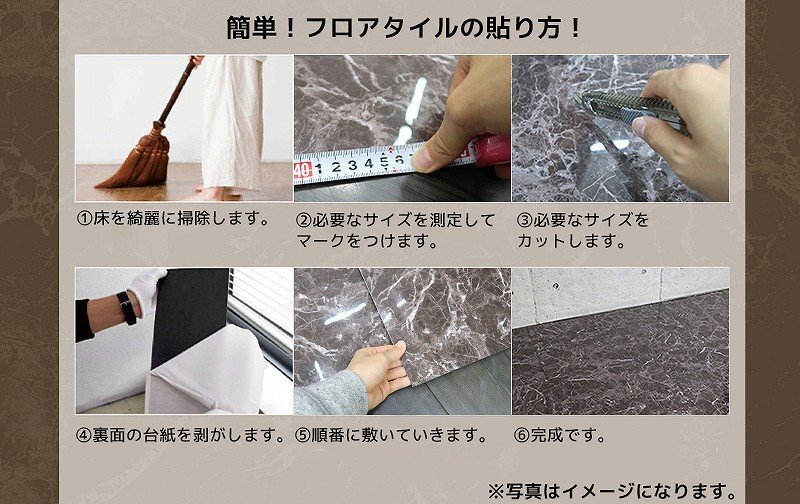 自分で出来る、簡単リノベーション! 貼るだけカンタン!のシール式フロアタイルシートです。 床の色やデザインが違うだけで雰囲気はガラリと変わります。 汚れの付きやすいキッチンや洗面所、 経年劣化などによるフローリングのキズや変色が気になる・・・ そういったお悩みを解決できるのがこの「フロアタイル」です。 毎日過ごすお部屋の床を低コストでリフォーム・模様替え出来ます♪ ■まるで本物の様なリアルな質感&デザイン! 細かい凹凸や模様の具合など、素材感にこだわって作られており、 リアルな質感なので安っぽさも感じさせず、手軽に高級感を演出。 ■裏面は粘着性があるので、接着剤なしで施工可能。 シートをはがして貼るだけ! ■カッターで簡単にカット! お部屋の形に合わせてカッターやハサミで簡単に加工できるので、 DIY初心者や女性でも簡単に施工できます。 ■圧倒的低コスト! フローリングの修繕やリフォームには膨大な費用かかってしまいます。 ですがこちらの貼るだけタイプのフロアタイルなら 「低コスト」でお部屋の雰囲気を変えられます! ※画像一枚目の丸窓部分に映しているのが 実物の商品の写真、色味になりますのでご参考ください。 ・1枚あたりのサイズ(約):高さ300mm×幅300m 厚み:2mm ・材質:PVC |