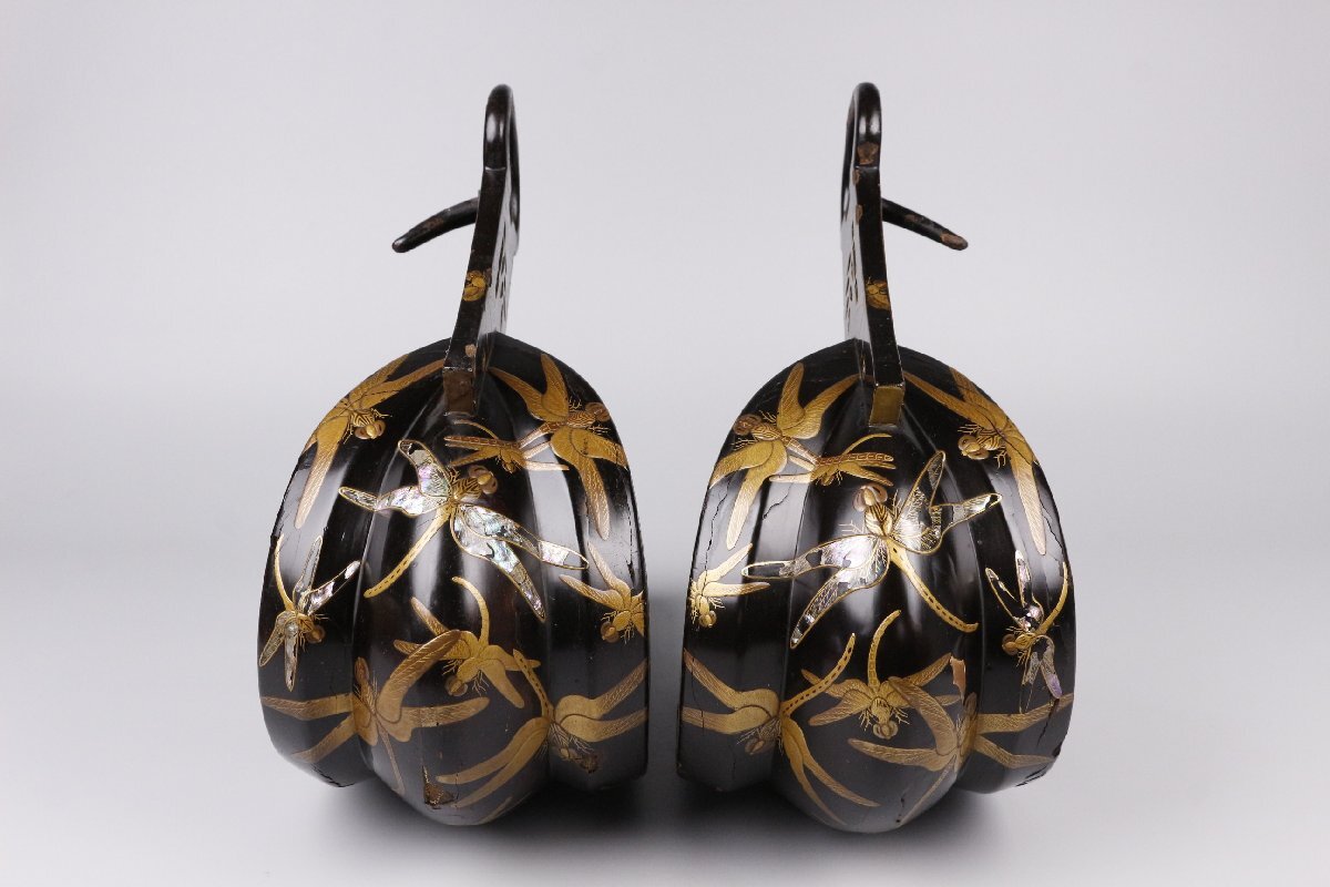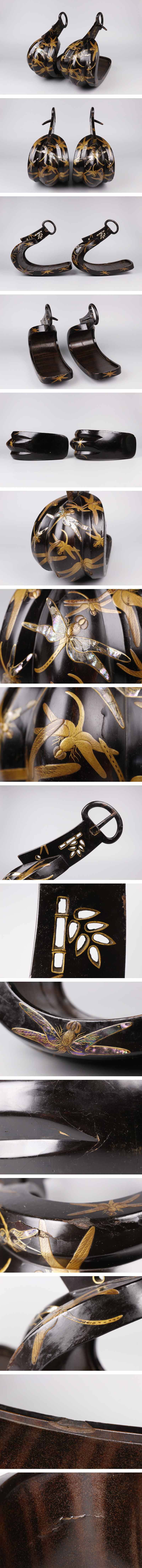 [.UU]25.10 251022N16* * * 商品詳細 * * * ここでしか出逢うことのできない唯一の美をご紹介させて頂きます。 螺鈿の煌びやかな輝きに鈍い輝きを放つ金蒔絵が緊張感のある 豪華な鐙のご紹介です。 蜻蛉が飛び交う鮮やかな仕上がりでとても華やかです。 トンボは前にしか進むことができず、後ろに下がらない(後退しない)ことから 「不退転」「必勝」の象徴、勝虫と言われ、縁起の良い虫として武具や装束に用いられました。 描写は細密でリアル、優美で力強い存在感を放つ逸品を この機会に是非お求めください。 ■商品内容/鐙 一対 ■サイズ/横12.5cm×縦25.5cm×奥行28.5㎝ ■状態/スレ、キズ、欠け、漆にヒビ、剥げ、 螺鈿に剥げ、経年による傷みがございます。 一部は鉄地です。 ※写真にてご確認、ご了承の上ご入札下さい。 ![]() !かんたん決済 * * * 発送詳細 * * * 入金確認後3営業日以内に発送致します。 ※直接引き取りも可能です。 60~160サイズにつきましては 佐川急便、ゆうパックのどちらかで発送いたします。 ゆうパック発送の場合、弊社の発送日から追跡サービスに問合せ番号が反映されるまで 約1日ほどお時間がかかりますのでご了承下さい。 * * * 注意事項 * * * 運送中の破損があった場合は速やかに当社までご連絡下さい。 保険を利用するのに受取連絡後に運送会社による現場での破損状況確認が必要となります。 勝手に返送されますと保険の適用外となりますのでご注意ください。 * * * * * * お問い合わせ:082-236-8669 |