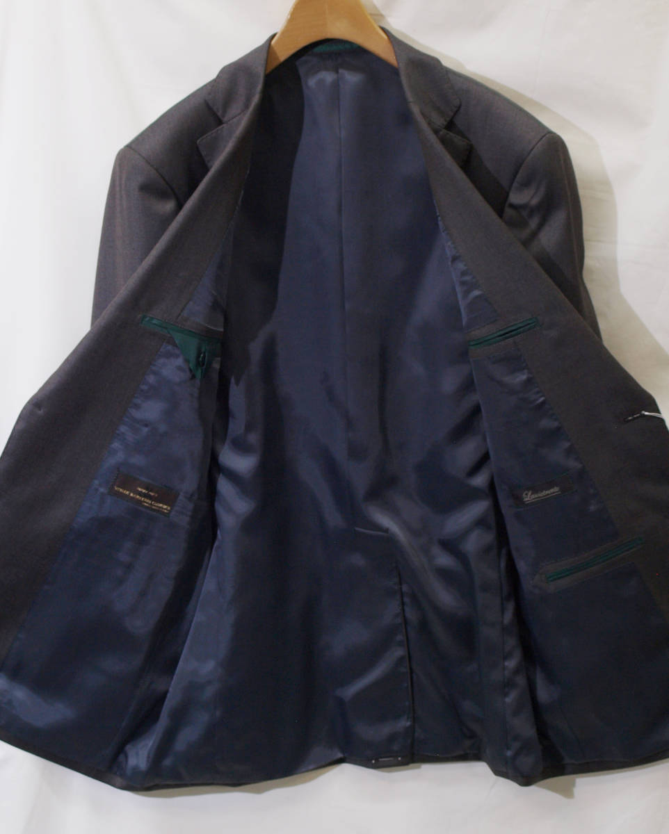 【サイズ】 A5 (AM/Y6号相当) 目安の体型 身長165cm~175cm、ウエストサイズ80cm前後 【ジャケット実寸】 肩幅45cm 着丈72cm 袖丈59.5cm 脇下部分51cm 身幅46cm 【パンツ実寸】 ウエスト(胴回り実寸)82cm わたり幅32.5cm 股下10cm部分27.5cm 裾幅20.5cm 脇股上24.5cm 前股上27.5cm 股下90cm(裾上げしていない状態/新品) 【素材】 表地:ウール(毛)100% 裏地:胴裏/キュプラ100% 袖裏/キュプラ100% ・イタリア、CANONICO社のSUPER110'S生地を使用 高級イタリア製生地特有のなめらかな触り心地と上品な艶のある上質な素材です。 【色】 あさめの茶色 【柄】 無地 【デザイン】 細すぎずかといってゆとりがありすぎることなく、体型に無理なくきれいにフィットする、シングル2つボタンスーツ、クラシコタイプ、新品、裾上げしていない状態です。 ・ジャケットはシングル2つボタンで細身~レギュラーの中間くらい ・パンツは股上は浅くなくウエストラインで履くタイプで、細すぎず、少しだけゆとりをもたせたちょうど良いくらいのすっきりとしたシルエットのスタイリッシュワンタックスラックスです。 流行に左右されないベーシックな無地こそ良いものをというコンセプトで生産されたスーツです。 スラックスが駄目になっても、ジャケットだけでちゃんとしたブレザー単品として使いまわしができます。 秋~冬~春先までの秋冬メインのシーズン対応商品です。 【縫製仕様】 ・ジャケットはシングル2つボタン、ノッチドラペル、襟元等AMFステッチ入り、切台場仕立て、袖口ボタン4つ、センターベント、内ポケット3つ(小ポケット1つ含む)、総裏地(秋冬物) ・パンツはワンタック、膝裏当て付き、脇ポケット斜め付け、後ろポケット左のみボタン付き、フロントはファスナーでボタン&ホック仕様/うちかけボタンあり 使用付属(肩パット/柔らかく薄手、毛芯、ボタン等々)もワンランク上のを使い、細部まできれいな縫製仕立てで仕上がっております。