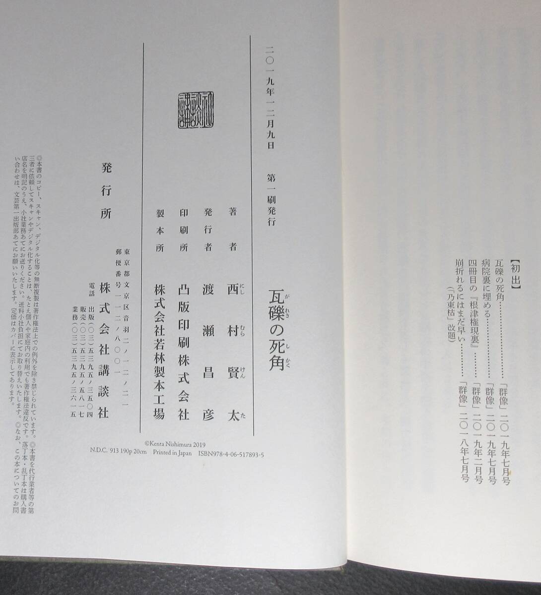 ●西村賢太/署名入り、 『瓦礫の死角』、装釘:浅妻健司、装画:信濃八太郎、講談社刊、2019年・初版(初刷)・カバー・帯付、約19.5×14cm