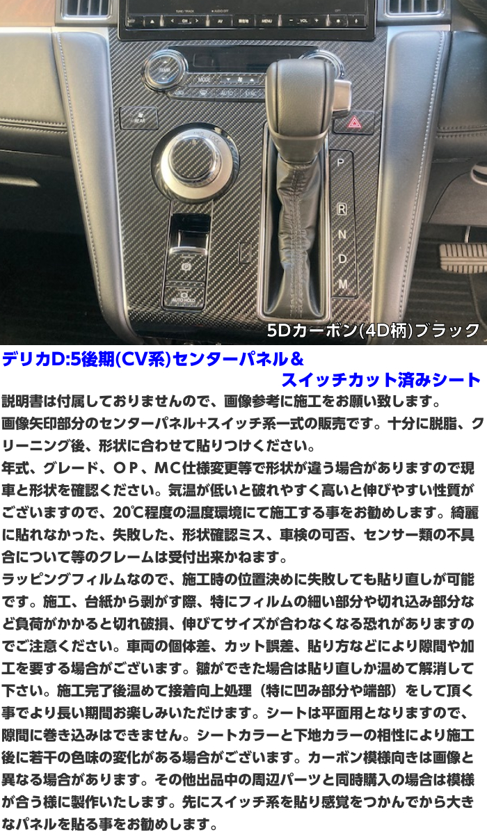 デリカD:5CV系後期 ディーゼル センターパネル&スイッチカット済みシート パネル部は大きく合わせる箇所が多いので、難しい場合はカット貼り合わせ等施工者技量に合わせて工夫ください。 施工完了後はしっかりと温めて接着向上処理をしてください。処理が甘いと浮きや角剥がれの原因となります。 MC仕様変更やOP、グレード等で形状が異なる場合がありますので現車をご確認ください。 ★材質:PVC ★厚さ 約0.12mm~0.18mm(シート種類による) ★耐熱90度 ★屋外約2-3年(メーカー値、使用環境、シートの種類による)