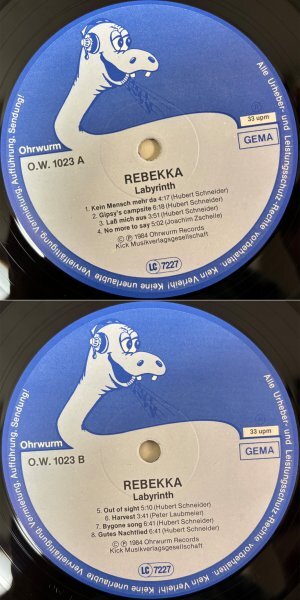 【 収録曲 】 A1. Kein Mensch Mehr Da 4:17 A2. Gipsy's Campsite 6:18 A3. Lass Mich Aus 3:51 A4. No More To Say 5:02 B1. Out Of Sight 5:10 B2. Harvest 3:41 B3. Bygone Song 6:41 B4. Gutes Nachtlied 4:13 【 Line-up / Musicians 】 - Marion Weldert / vocals - Hubert Schneider / guitar, flute - Peter Laubmeier / keyboards, vocals - Joachim Zscheile / bass - Jürgen Schlachter / drums ※1984年にリリースされたREBEKKAの2nd『Labyrinth』は、前作のシンフォニック寄りプログレ路線から大きく舵を切り、より時代性に沿ったポップ/ロック寄りのサウンドへと移行した作品である。レーベル移籍に加え、ヴォーカルのマリオン・ヴェルダートが英語詞を中心に据え、歌を前面に押し出した構成となり、楽曲は短くシンプルでキャッチーな印象が強い。ギター・アルペジオやアリーナロック調のドラミングなど、80年代中期のドイツロックやNDWの影響も感じられる。一方、後半にはピアノを軸としたしっとりとした曲や、ドイツ語歌唱が戻る場面もあり、かつての叙情的な響きが顔を覗かせる。総じてプログレ的要素は控えめであるが、繊細なピアノが作品全体を上品にまとめている一枚と言える。現在は入手が難しく、コレクター向けのタイトルである。 ( progarchivesより翻訳・要約 ) 【 参考音源 】 Lass Mich Aus Out Of Sight Harvest Bygone Song |