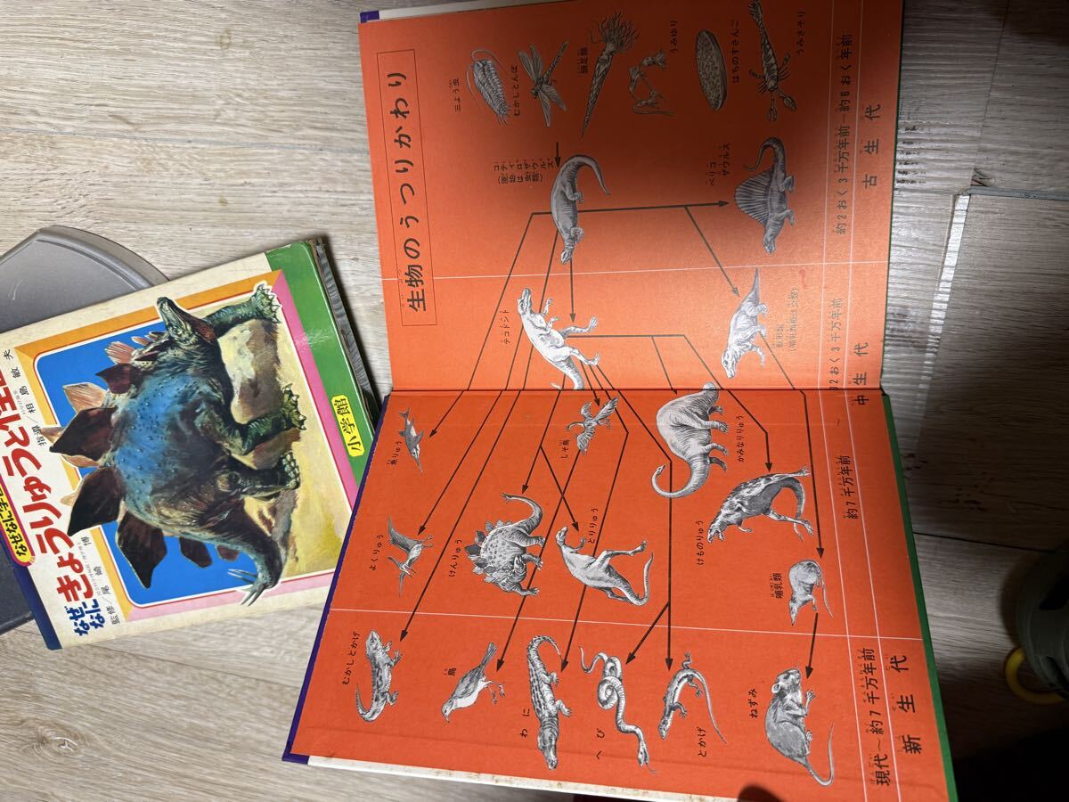 昭和45年(1970年)発行、小学館の学習絵本シリーズ『なぜなに学習図鑑① きょうりゅうと怪獣』です。恐竜の科学的知識と空想的な怪獣の世界を融合させた、当時としては画期的な内容で、昭和の児童文化・特撮ブームを象徴する名作です。監修は国立科学博物館の理学博士・尾崎博氏、指導は科学教育家の相島敏夫氏。恐竜復元画の転換期にあたる時代の貴重な図鑑であり、実在する生物と創作怪獣を同列に紹介する構成はこの時代特有のものです。| 出价者 | 信用 | 价格 | 时间 |
