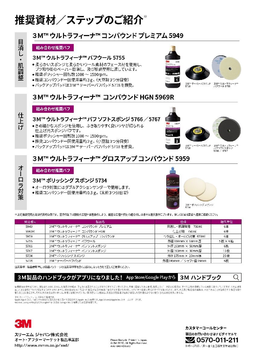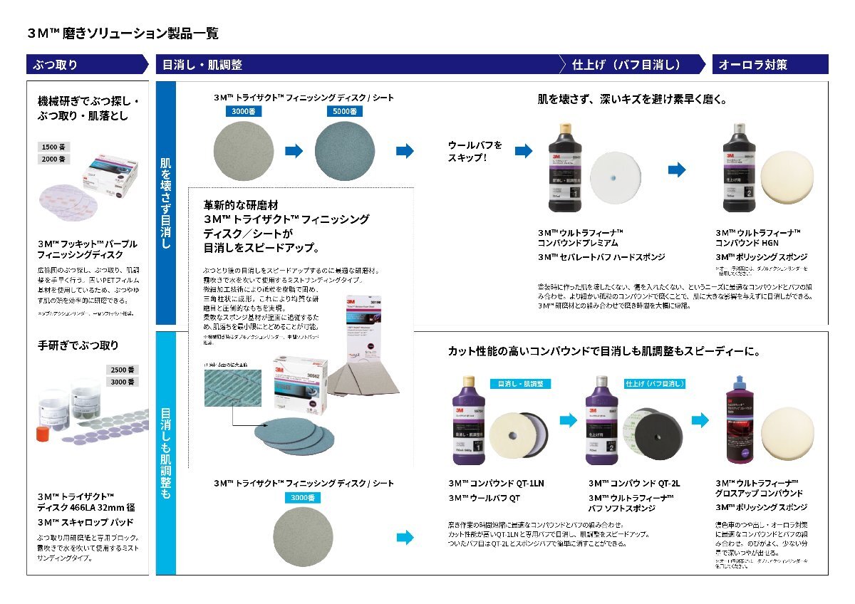 硬化の進んだ濃色塗膜に対し、シングルポリッシャーと3Mウルトラフィーナバフ スポンジとの組み合わせでバフ目を効果的に消します。ダブルアクションサンダーと3Mポリッシングスポンジ5734との組み合わせでバフ目を消しながらオーロラマークを除去することができます。