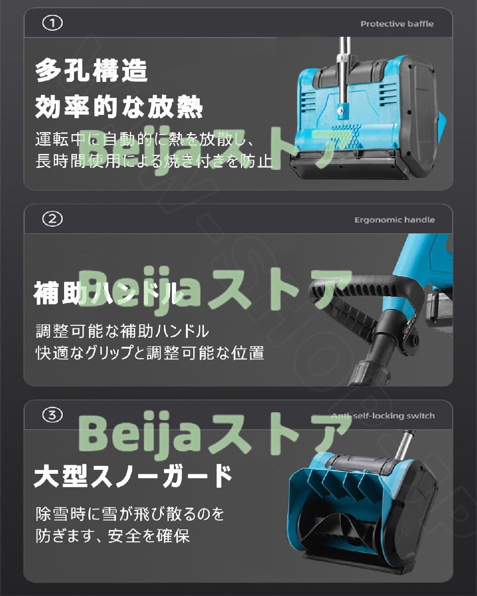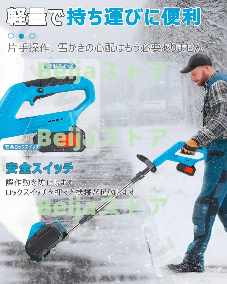 ?このリチウム電池式除雪機は、折りたたみ式の画期的な設計が最大の特徴です。折りたたむことで収納時に場所をほとんど取らず、ガレージの隅や部屋の片隅に簡単に保管でき、持ち運びも軽やかで、車に積んで遠出先へ持って行くのも楽々です。用途は多岐にわたり、家庭用の車道や庭はもちろん、市街地の道路、工場の敷地といった様々な場所の積雪を、迅速かつ効果的に掃除することが可能です。どんな雪の状況にも柔軟に対応し、快適な空間を取り戻します。軽量な素材を採用しているため、片手で操作することもでき、腰にかかる負担が非常に少なく、手動で除雪する場合に比べて、はるかに効率的に作業を進めることができ、長時間の除雪作業にも耐えられます。大容量のリチウムバッテリーを搭載しており、強力な出力を持続的に提供します。除雪幅 28CM、除雪深さ 17.8CM というスペックで、様々な厚さや質感の積雪にもしっかりと対応し、効率的な除雪を実現します。安全面では、安全ロックスイッチが誤作動を防止し、使い心地の良い調整可能な補助ハンドルと、除雪時の雪の飛散を防ぐ大型スノーガードにより、安全かつ快適に作業ができます。また、多孔構造による効率的な放熱で長時間使用時の焼き付きが防止され、折りたたみ式設計なので収納も簡単で場所を取りません。市街地道路や工場道路、住宅地など複数の環境にも適用可能で、あらゆる積雪対策シーンで信頼できるパートナーとなります。