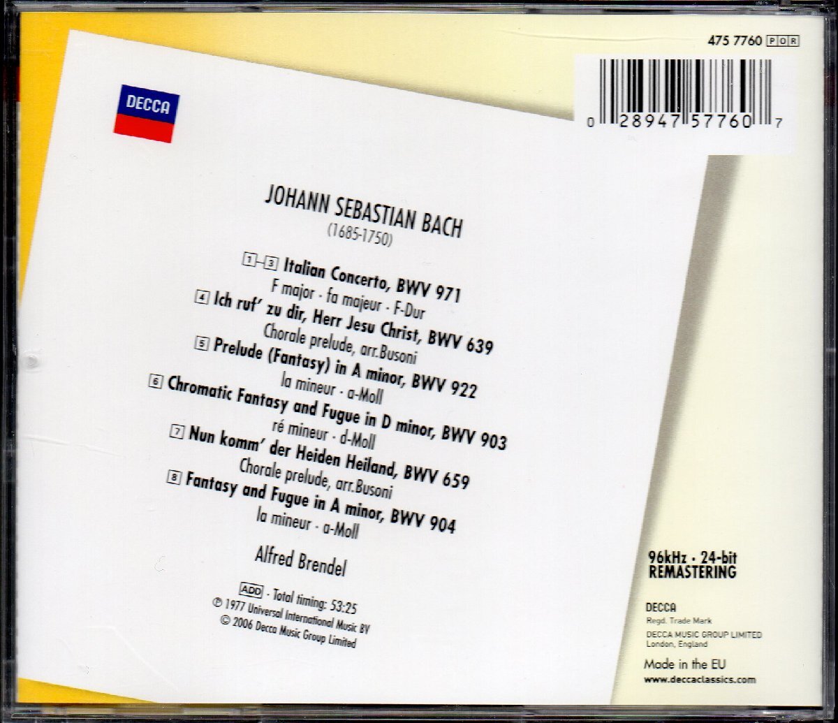 -意外なことにこれがブレンデル唯一のバッハ・アルバム。平均律やゴルトベルク変奏曲はリサイタルでも演奏しなかったのでしょうか。
