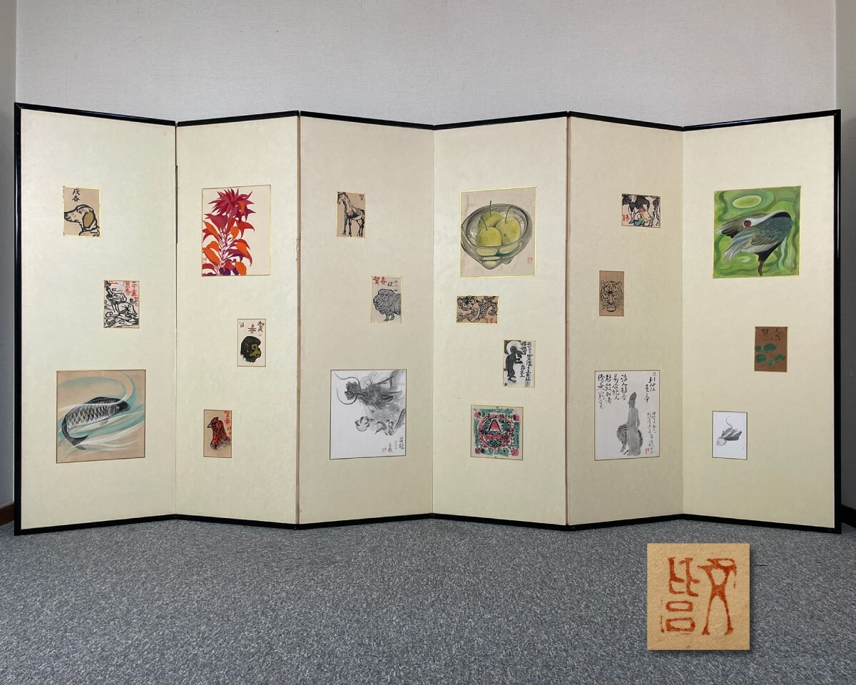 A671【真作】文展 民藝 動物板画 賀春 干支 十二支 落款印 六曲屏風 六曲半双 時代屏風 間仕切 半双 折畳 折り畳み 衝立 つい立 背景 [浏览原始页面]