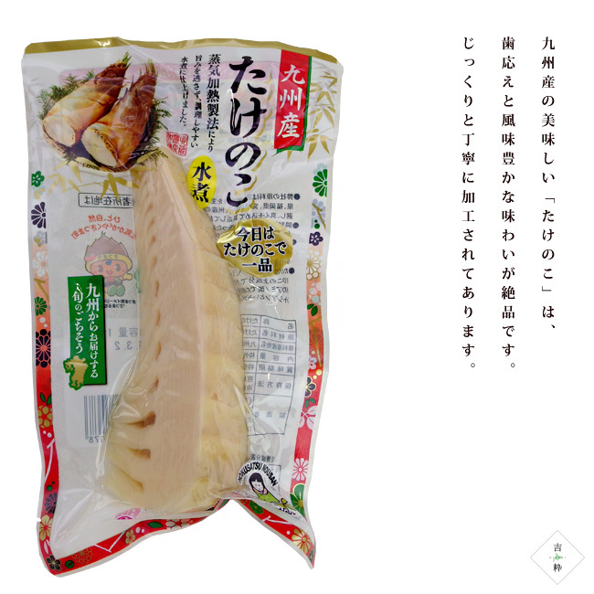 | 保存方法 | 直射日光、高温多湿な場所を避け冷暗所で保存して下さい。 ●開封後は充分に水を張った容器に入れ、冷蔵庫(10℃以下)で保存し、お早めにお召し上がり下さい。 ●たけのこに付着している白い結晶や液体は、たけのこの主成分でチロシンというタンパク質成分のアミノ酸です。根の部分の青紫の斑点は、アントシアンという天然含用物です。 | ||