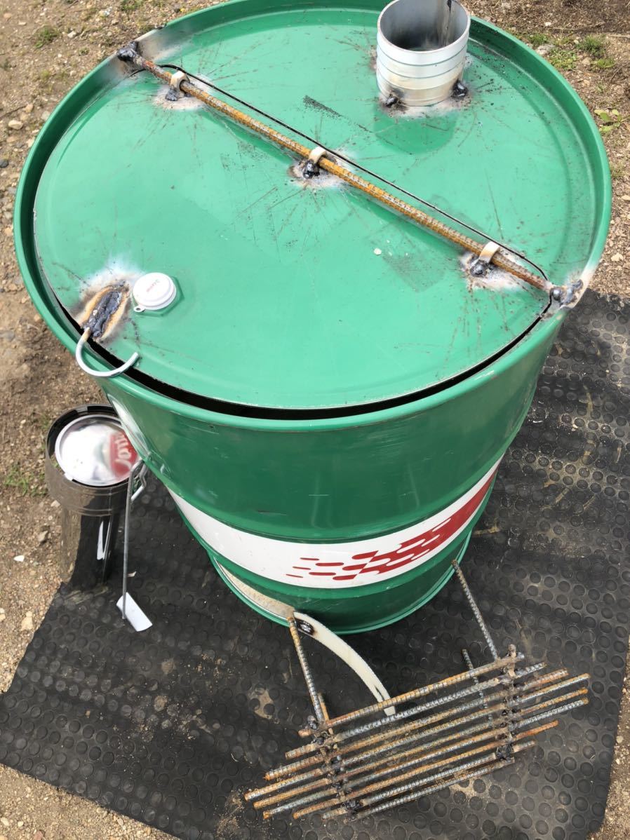 送料負担願います 未使用。鉄。中古の200Lドラム缶で作成。ロストル付。本体Ф56*h88、灰取口w25*h24。sステンレス煙突有。ふたあり、、灰とり棒付。灰取り口カバ―付。