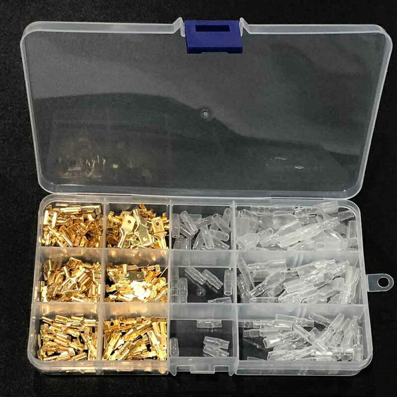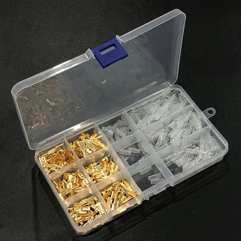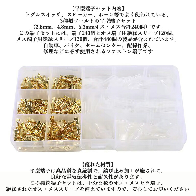 【平型端子セット内容】トグルスイッチ、スピーカー、ホーン等でよく使われている、3種類ゴールドの平型端子セット(2.8mm、4.8mm、6.3mmオス・メス合計240個)です。この端子セットには、端子240個とオス端子用絶縁スリーブ120個、メス端子用絶縁スリーブ120個、合計480個の製品が含まれています。自動車、バイク、ホームセンター、配線作業、修理などに必ず使用されるファストン端子です