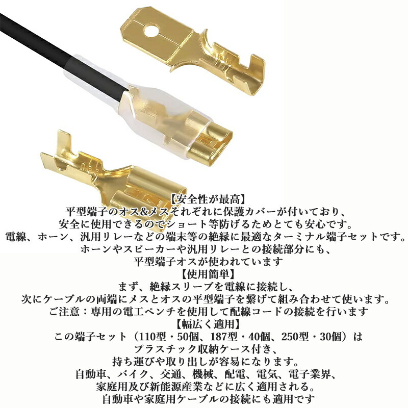 【幅広く適用】この端子セット(110型・50個、187型・40個、250型・30個)はプラスチック収納ケース付き、持ち運びや取り出しが容易になります。