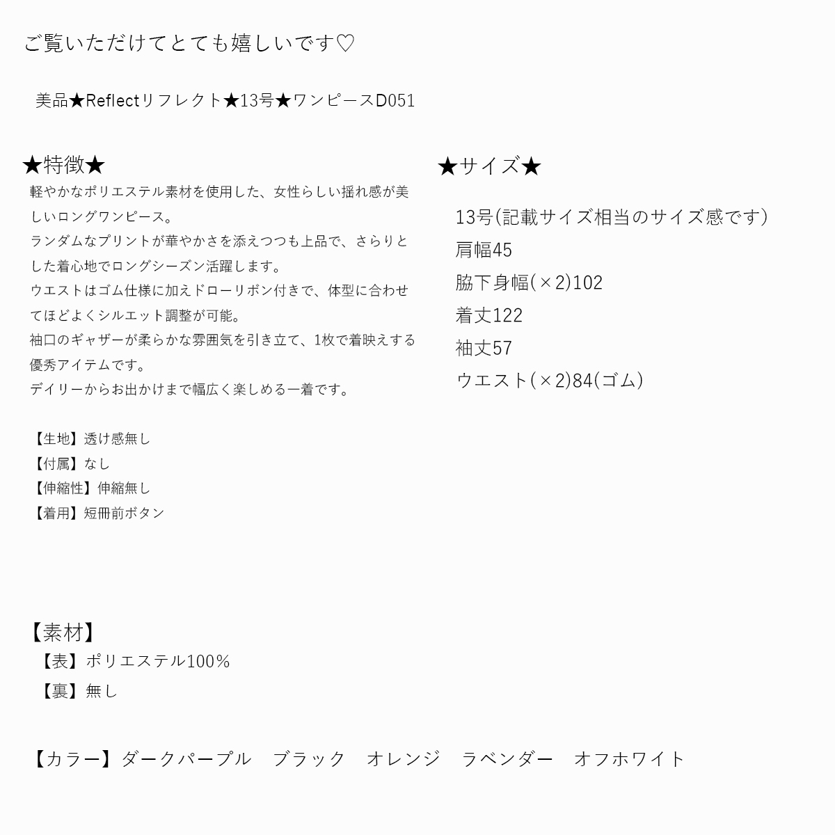 ★コメント★ *キャンセル・返品について ご入札後のキャンセル、 落札後の返品・交換はご遠慮頂いております。 商品に不備がある場合は取引ナビよりご連絡をいただけたら幸いです。 最後まで誠実に対応努めます。 何卒ご理解いただけますようよろしくお願い致します 。 *商品状態 出来る限り気持ち良くお召しいただけるよう心がけます★ 管理には十分気をつけております。 見落としやサイズ計測の誤差などがある可能性もございます。 完璧な商品をお求めの方はご入札をお控えくださいませm(_ _)m *付属品(インナーやベルト等)もともとついていたものが無い場合は記載いたします。 品質表示に記載がない場合は対応できないことをご了承くださいませ。 *即決について 大変申し訳ございません。オークション即決はお受けしてございません。 ご了承いただけたら幸いでございます。 *悪い評価のある方、新規IDの方の入札について こちらの判断によりお取り消しさせて頂く場合がございます。 出品者の立場から落札者様に規定を設け本当に申し訳ございませんが ご了承頂けたらと思います。 *ご質問について 日曜日(オークション終了日)ご質問の返信が出来ない事がございます。 購入時期、購入価格等わかる物に関してはできる限り記載をいたします★ その旨のご質問に関しても同様に返信できない場合がございます。 ご了承下さいませ。 不便でございますがご了承いただけたら幸いです。 毎週火曜日500着程、新しい商品を出品してございます! 日曜日、月曜日22時から23時終了するよう設定してございます。 お時間がございましたらご覧いただけましたら嬉しく思います★ 何かございましたらお気軽にご質問お待ち申し上げます! |