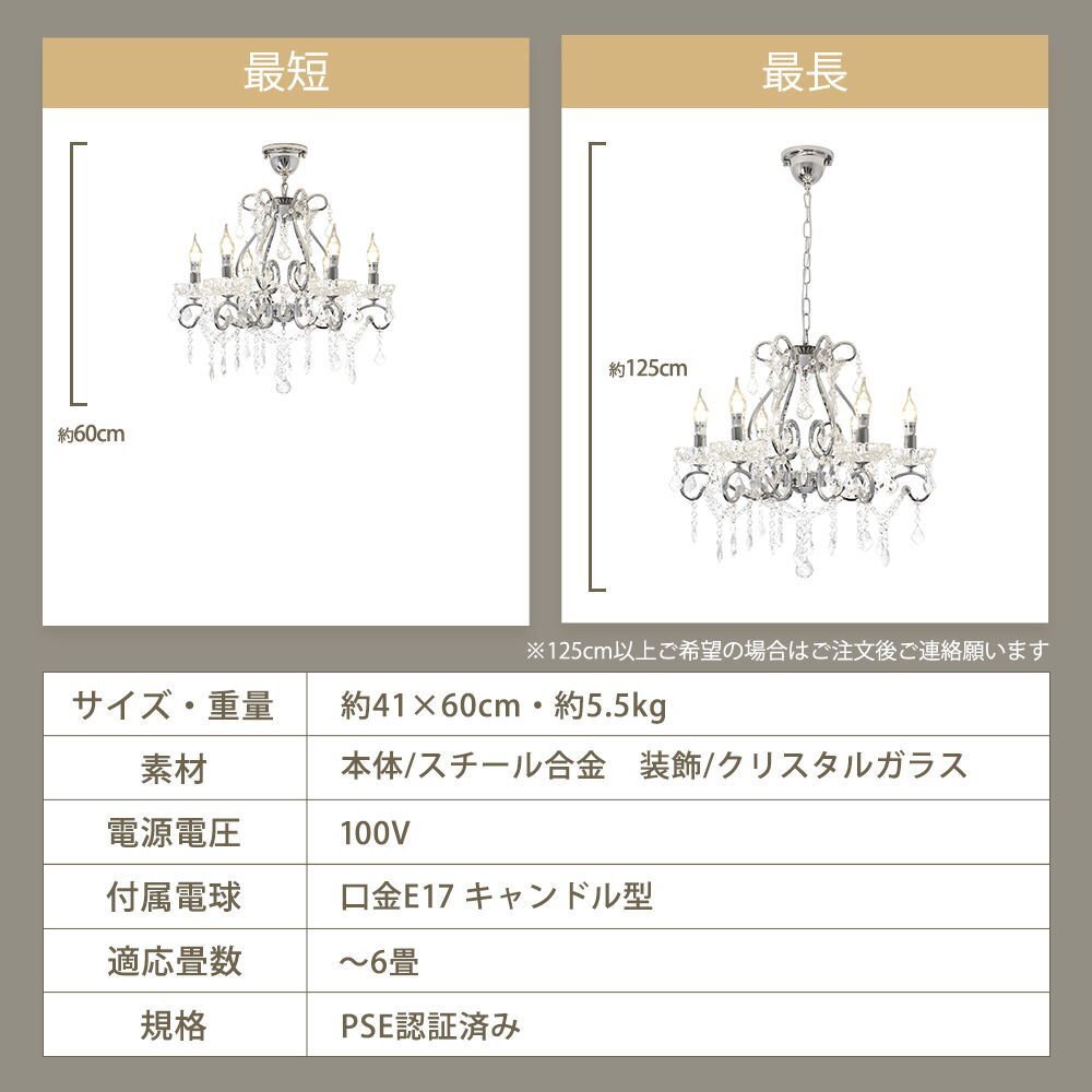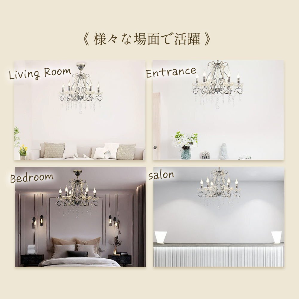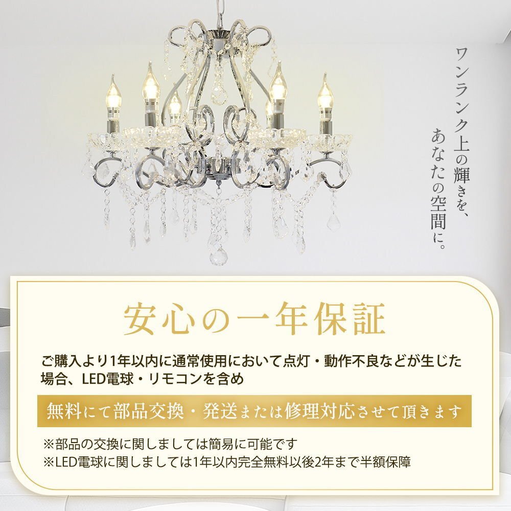 | 商品説明 | ![]() ☆LED電球サービスキャンペーン開催中!☆【送料無料!】新品 キャンドル6灯 クリスタル シャンデリア♪ ●キャンペーン期間中 広角LED電球6灯(¥7200-相当)お付けいたしまして驚きのプライス! ☆LED電球サービスキャンペーン開催中!☆ ※通常電球別売の為、価格記載の電球画像掲載がございますがキャンペーン期間中は無償提供(調光別途¥200-)させて頂いております※ ☆上質水晶ならではの最高の輝きを放つ新品クリスタルシャンデリア ☆添付画像では肉眼で見る本来のクリスタルの輝きをご確認いただけませんが、6灯の電球が上質クリスタル水晶を通し光の屈折で光の持つ本来のカラーをかもし出しダイヤモンドのように輝きながらワット数以上の明るさでお部屋を照らします ☆スタイルは飽きの来ないシンプルなデザインです♪ ☆とても明るくおしゃれなシャンデリアです ☆シャンデリア本体は調光にも対応しております ※調光ご希望の場合、調光対応LED1個¥200-アップと汎用調光器(Panasonic製LED用調光器推奨)が必要です ☆付属電球・・・口金E 17キャンドル型 広角LED 白色又は暖色6灯(明るさ40ワット消費電力4ワット 暖色36Lm/W・白色40Lm/W) ※調光対応LED1個別途¥200- ※注文後ご希望のLEDをお申し付けください ☆取り付けに関しましてはワンタッチでは御座いませんが(配線はワンタッチ)引掛けシーリングに対応しております ☆リビング等に最適なゴージャスクリスタルシャンデリアを是非この機会に! ☆サイズ・天井より下に最短60cm(飾り部分含む)から最長125cmまで調整可能 直径約60cm 重量約5.5キロです ※125センチ以上必要の場合はご注文後お申し付けください ![]() |