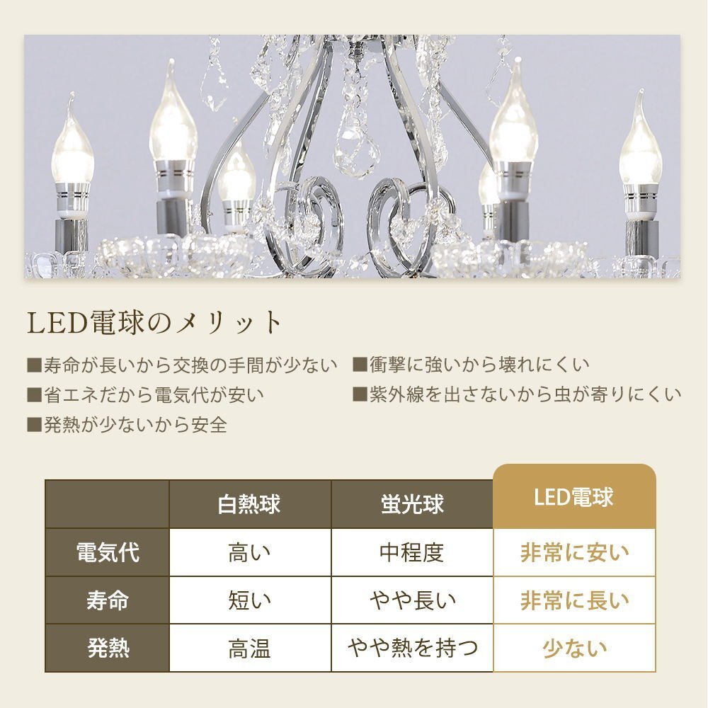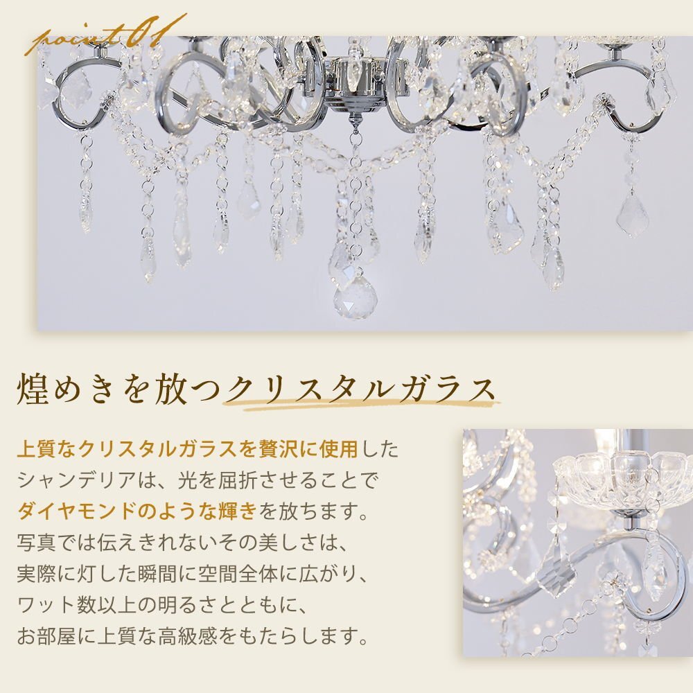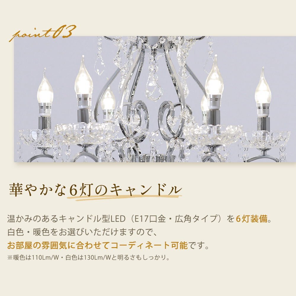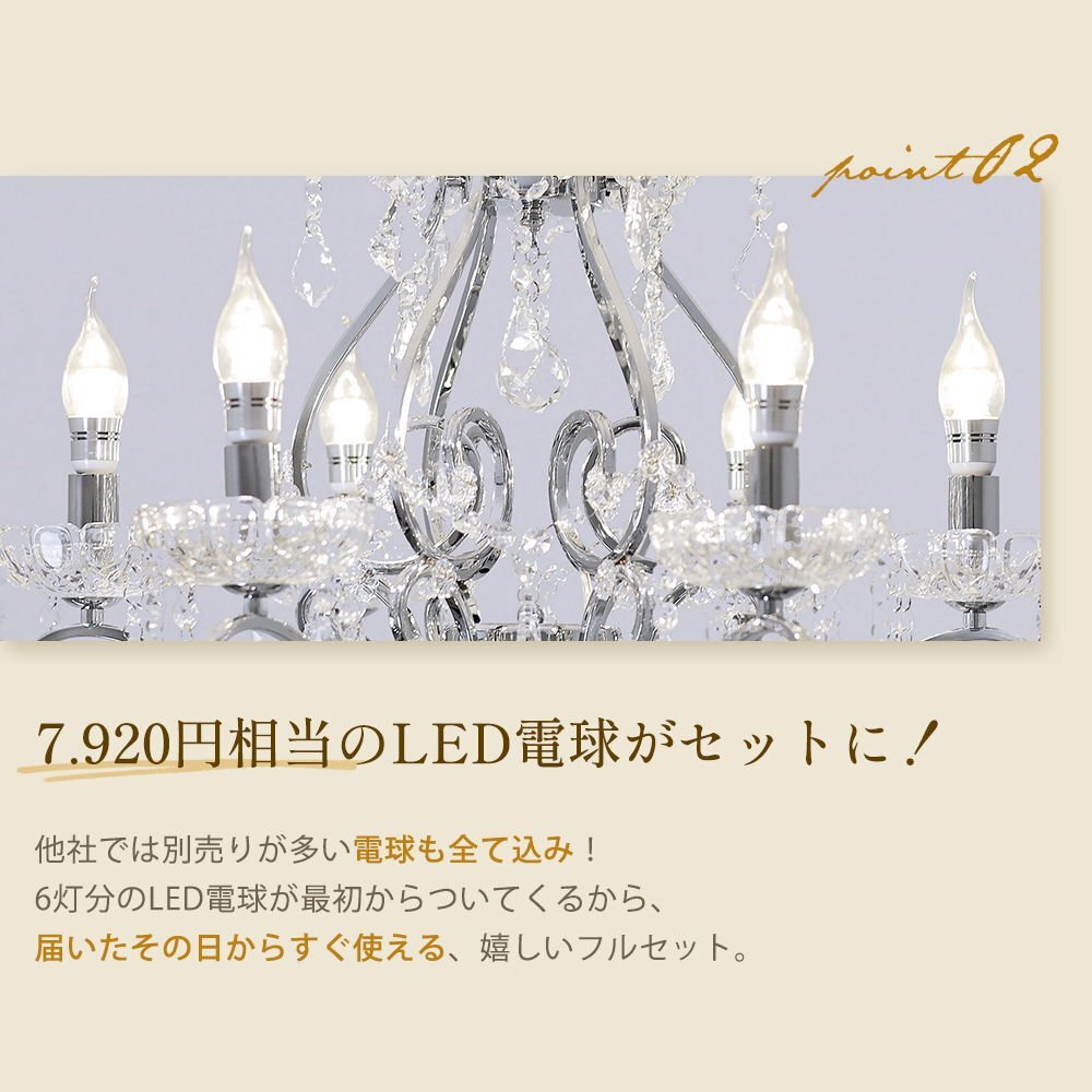 | 商品説明 | ![]() ☆LED電球サービスキャンペーン開催中!☆【送料無料!】新品 キャンドル6灯 クリスタル シャンデリア♪ ●キャンペーン期間中 広角LED電球6灯(¥7200-相当)お付けいたしまして驚きのプライス! ☆LED電球サービスキャンペーン開催中!☆ ※通常電球別売の為、価格記載の電球画像掲載がございますがキャンペーン期間中は無償提供(調光別途¥200-)させて頂いております※ ☆上質水晶ならではの最高の輝きを放つ新品クリスタルシャンデリア ☆添付画像では肉眼で見る本来のクリスタルの輝きをご確認いただけませんが、6灯の電球が上質クリスタル水晶を通し光の屈折で光の持つ本来のカラーをかもし出しダイヤモンドのように輝きながらワット数以上の明るさでお部屋を照らします ☆スタイルは飽きの来ないシンプルなデザインです♪ ☆とても明るくおしゃれなシャンデリアです ☆シャンデリア本体は調光にも対応しております ※調光ご希望の場合、調光対応LED1個¥200-アップと汎用調光器(Panasonic製LED用調光器推奨)が必要です ☆付属電球・・・口金E 17キャンドル型 広角LED 白色又は暖色6灯(明るさ40ワット消費電力4ワット 暖色36Lm/W・白色40Lm/W) ※調光対応LED1個別途¥200- ※注文後ご希望のLEDをお申し付けください ☆取り付けに関しましてはワンタッチでは御座いませんが(配線はワンタッチ)引掛けシーリングに対応しております ☆リビング等に最適なゴージャスクリスタルシャンデリアを是非この機会に! ☆サイズ・天井より下に最短60cm(飾り部分含む)から最長125cmまで調整可能 直径約60cm 重量約5.5キロです ※125センチ以上必要の場合はご注文後お申し付けください ![]() |