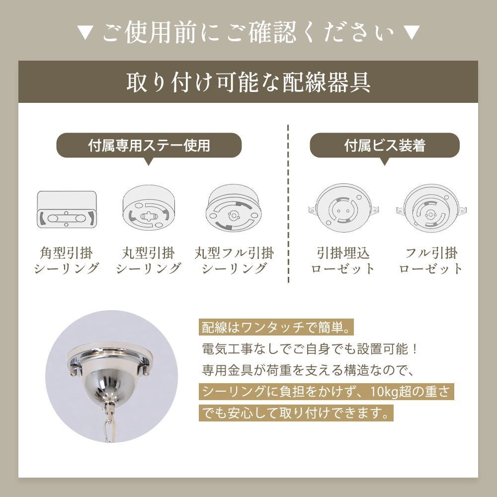 | 注意事項 | 新品・未使用品での販売ですが製造上での多少の小傷等はご了承願います 取り付けに関しましてはワンタッチでは御座いませんが(配線はワンタッチ)引掛けシーリングに対応しております、取り付け説明を参考に組み立て・結線して下さい、ご心配の場合は安全を期して最寄の電気工事店にご依頼をお勧めいたします また取り付け方等事前にお知りになりたい方はお気軽に質問コーナー又はfirst@kuk.ne.jpにお問い合わせお願い致します 調光ご希望の場合、調光対応LED1個¥200-アップと汎用調光器(Panasonic製LED用調光器推奨)が必要です 調光不可LED電球使用時、壁スイッチが調光スイッチ又はホタルスイッチの場合はLED不具合の原因になりますのでON/OFFのみのスイッチでご使用願います 店頭販売もしており重複した場合キャンセルさせていただく場合がございますがあらかじめご了承願います |