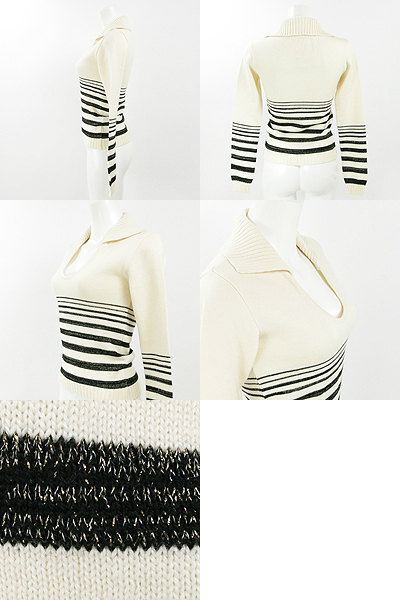 | アクリルウールニット素材で着心地柔らか♪ 衿部分はリブ編みでクラシカルな雰囲気が漂うから、 カジュアルなアイテムと組み合わせてもきちんとした印象に★ オフホワイト地にゴールドラメブレンドの黒が映える ボーダーデザインでクールにも着ていただけます☆ 美しいUネックがインナーとの組み合わせを楽しませてくれますよ◎ 着丈約55cm袖丈約59cm肩幅約37cmバスト約70cm 【サイズ】:(I40) 【素 材】:(ウール50% ポリエステル50% ) 【 色 】:(オフ白、黒) 【程 度】:(A) 20110928-001 211 021 | ||||