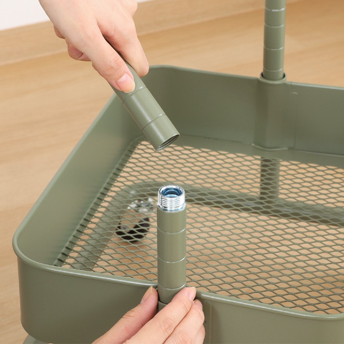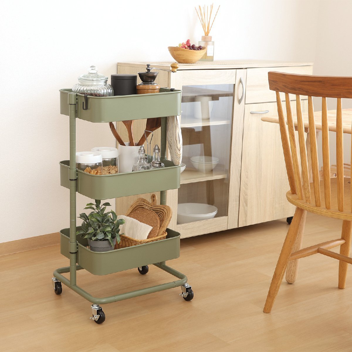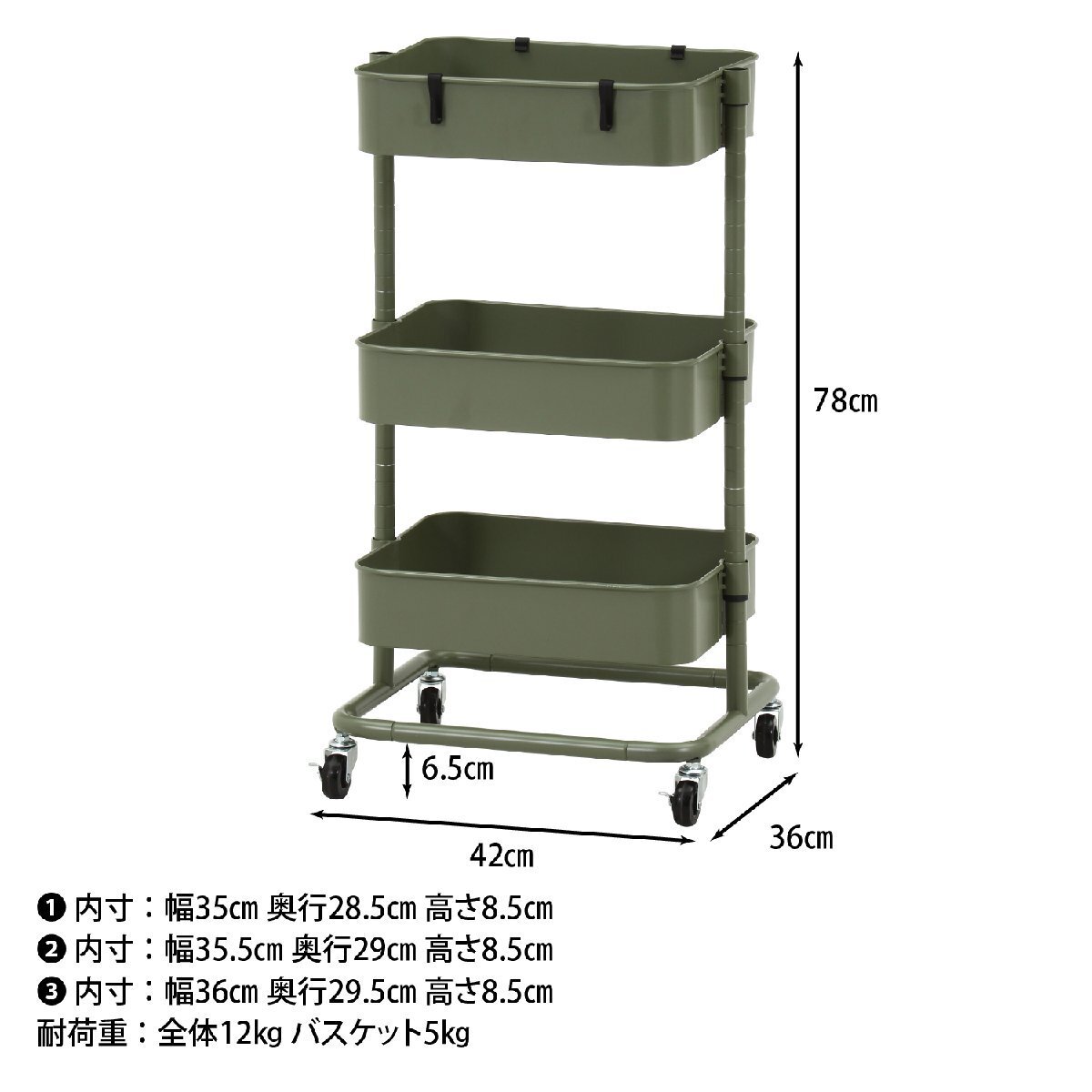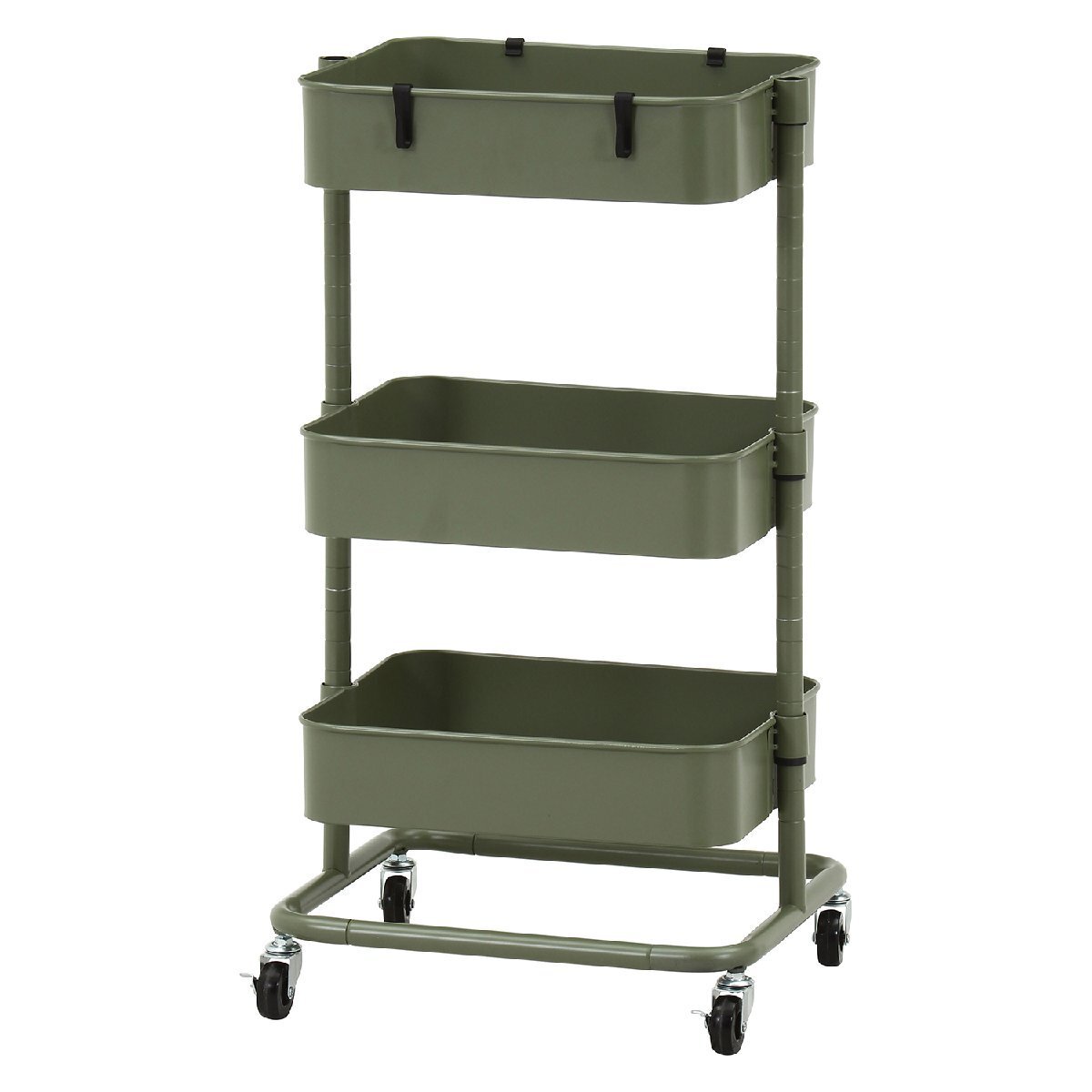 | 備 考 | ■ネジいらずでクイックに組み立て可能です。 ■バスケットの高さを調整できるトローリーワゴンです。 ■おしゃれなインテリアワゴンです。 |