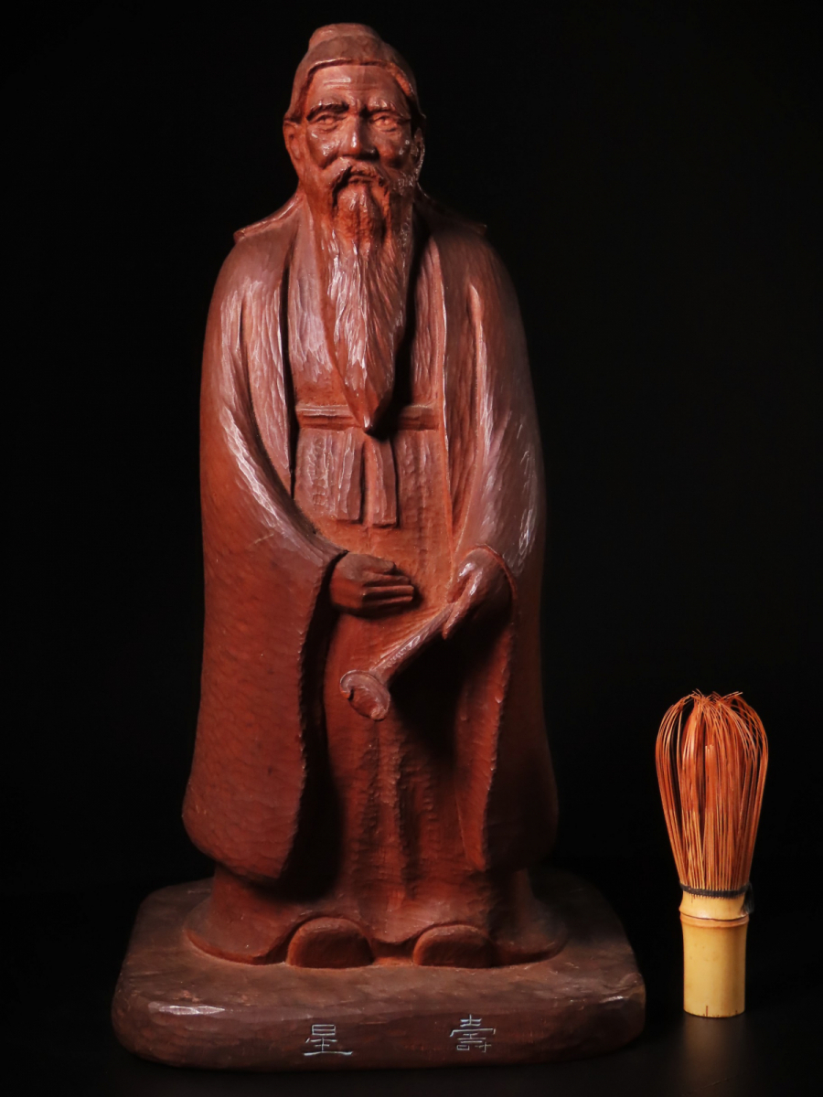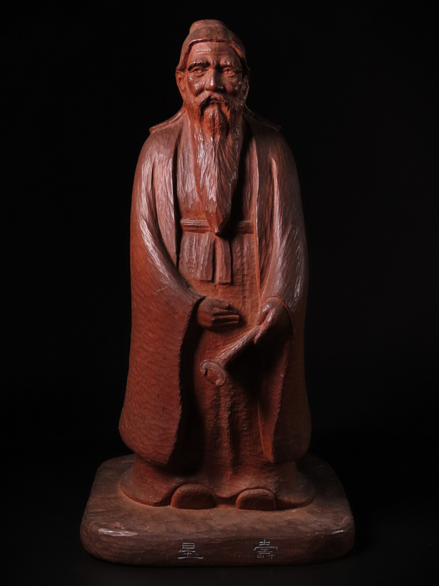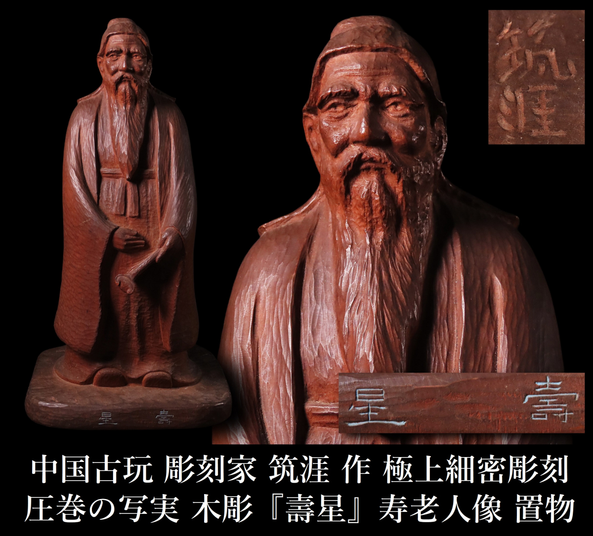 【ONE'S】中国古玩 彫刻家 筑涯 本人作 圧巻の写実 木彫 『壽星』 寿老人像 極上細密彫刻 置物 高34.2cm 重量1.6kg 古美術品 | |||