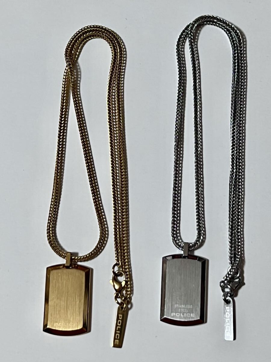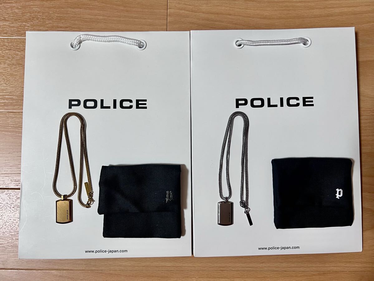 POLICEのシルバーとゴールドのネックレス、チェーンは49cmで保存袋×2とショップ袋×2 29cm×21.5cm×9.5cmのセットです。