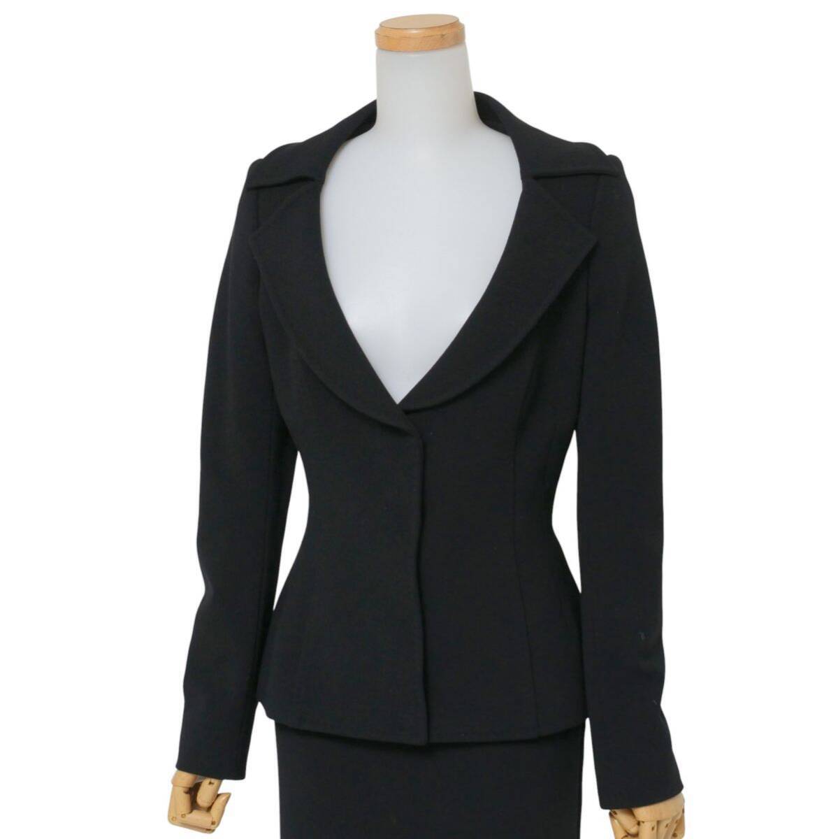 伸縮性のあるニット生地を使用した、テーラードジャケットとタイトスカートのセット◎