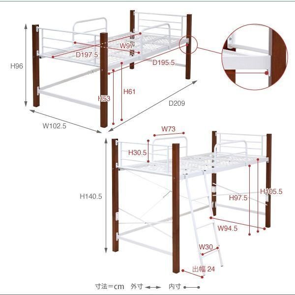 | 【カラー】 ブラック×ブラウン、ホワイト×ブラウン、ホワイト×ナチュラル、ブラック×ナチュラル 【サイズ】 <外寸> 幅102.5×奥行209×高さ140.5cm <内寸> (共通) 床面:幅97×奥行197.5cm サイドガード:幅73×高さ30.5cm (ミドルタイプ) 床面高さ:高さ61cm 床面下:幅94.5×奥行195.5×高さ53cm (ハイタイプ) 床面高さ:高さ105.5cm 床面下:幅94.5×奥行195.5×高さ97.5cm はしご出幅:24cm 【材質】 フレーム:スチール(粉体塗装) 支柱:ラバーウッド(ラッカー塗装) 【耐荷重】 床面:120kg以下 【生産国】 マレーシア 【梱包】3梱包でお届けします。 3-1 サイズ:103×40×14.5cm、重量:23.5kg 3-2 サイズ:95.5×46×16cm、重量:13kg 3-3 サイズ:105×40×12cm、重量:9kg 【その他】 ・ミドル/ハイ組み替え可能 ・六角レンチ、スパナ同梱 ・支柱は天然木を使用しているため、商品によって色味や木目などの風合いが異なります。 【組み立て品】 お客様による組み立てが必要です。 【ご注意】 ・サイズ、重量は概算です。 ・商品カラーはご使用のモニターによって実際の明るさや色と異なって見える場合がございます。 |