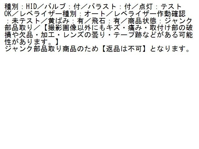 | 商品情報 | 種別:HID/バルブ:付/バラスト:付/点灯:テストOK/レベライザー種別:オート/レベライザー作動確認:未テスト/黄ばみ:有/飛石:有/商品状態:ジャンク部品取り/【撮影画像以外にもキズ・痛み・取付け部の破損や欠品・加工・レンズの曇り・テープ跡などがある可能性があります。】 | ||