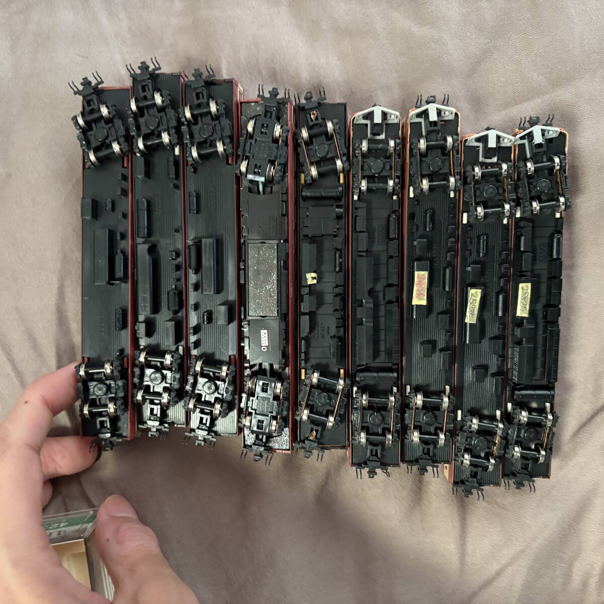 | ★商品説明★ | ・KATO製457系を9両出品いたします。ピン留め台車の旧製品となりますが、品番10-1154の現行製品と遜色ございません。 ・クモハ457・クハ455・サロ455が各2両、モハ456M車T車・サハシ455が各1両となります。 ・動作確認済。先頭車のうち2両は前照灯・尾灯が点灯、一部車両は室内灯を装備。M車も作動はしますが思わしくありません。 ・知人から譲り受けたものの使用するめどが立たなかったため、今回出品いたします。 ・一部車両のケースはございません。 | ||
