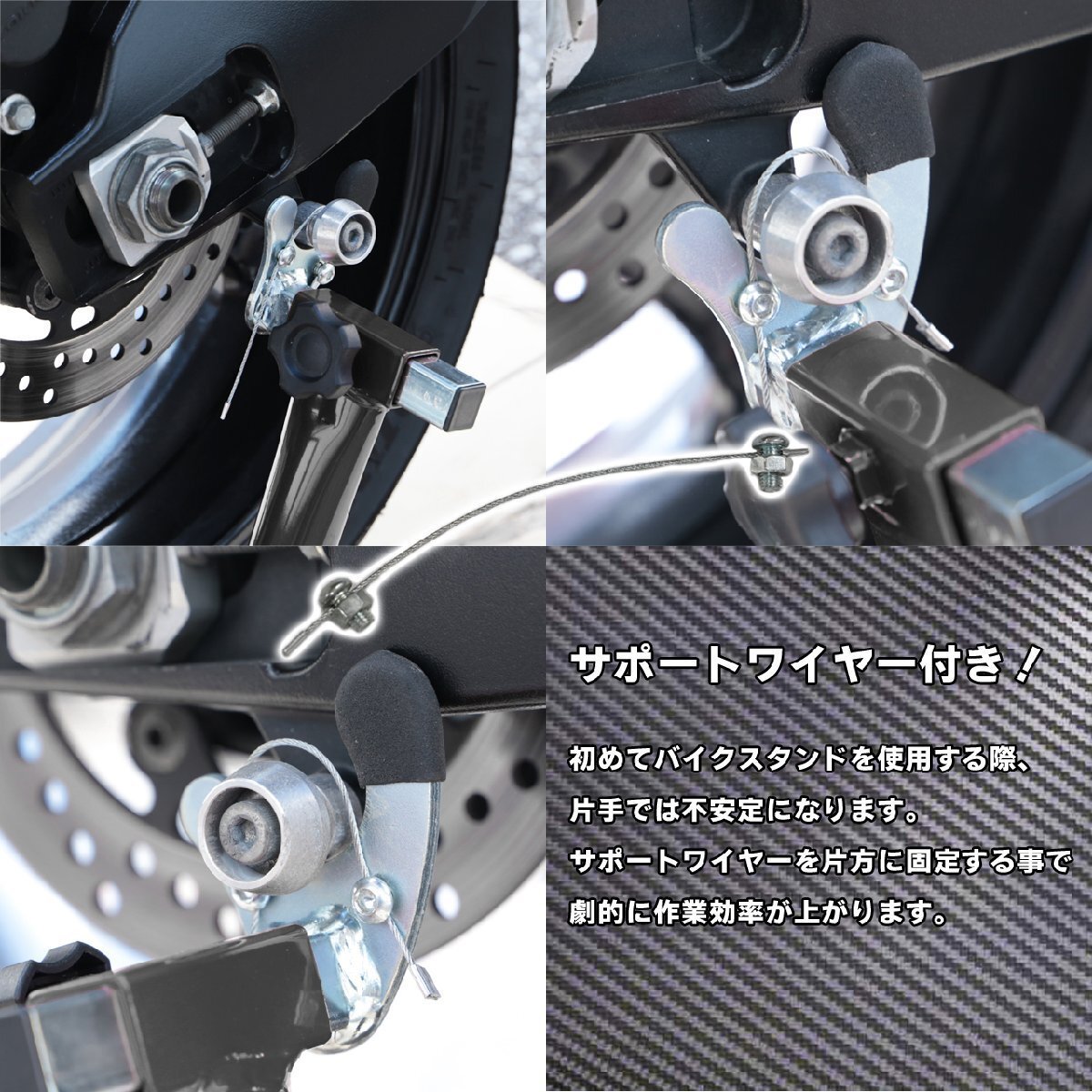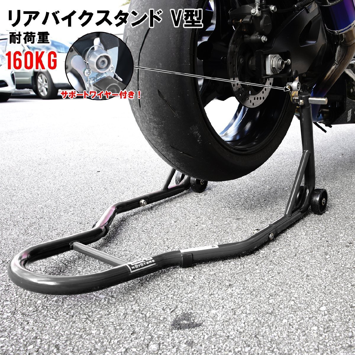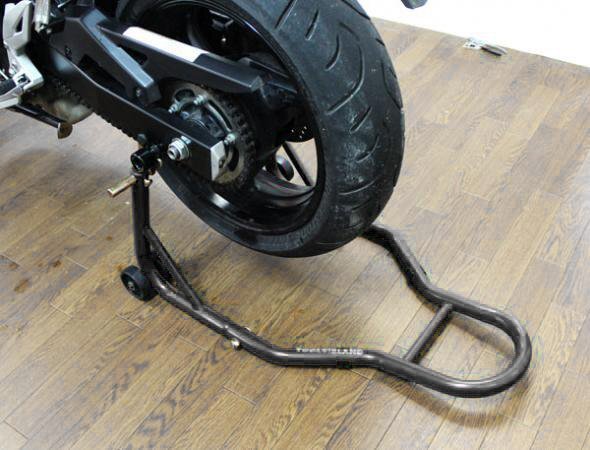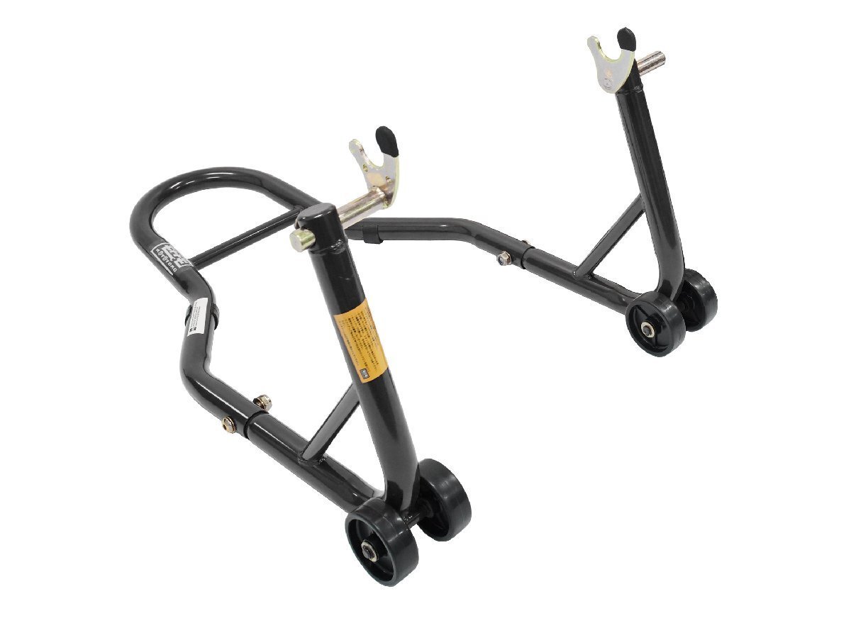 | 商 品 詳 細 | バイクのメンテナンスから、修理などの整備まで幅広く使用可能な後輪用バイクスタンドです。 Φ32の極太パイプの後輪用【軽量バイクスタンド】 最大幅370mmで、国産/輸入車問わず対応! 抜群の安定感と、上げ下ろしが楽な形状など細部まで拘ったスタンドです。 保持面はアルミフック使用(別売り)で【スイングアーム】に傷が付きません。 バイクスタンドからの落車・転倒防止のため、Vフックの位置セット後に、 【仕様】 耐荷重:約160kg スイングアーム幅:255~370mm 保持高さ:355mm 重量:4.2kg 【注意事項】 ※組立が必要な商品で、組立道具は付属しておりません。 ※製品仕様、使用方法を熟知してからご使用ください。 ※誤った使用方法により生じた、商品破損、人体への傷害、物品への損害、その他のいかなる損害に対しても、 当社では一切の保証、並びに責務を負いかねますので、ご了承ください。 ※本製品はメンテナンス用品です。ディスプレイや保管用としてなど、本来の用途以外には使用しないでください。 ※使用する際は必ず、2名以上で作業を行なってください。 ※スイングアーム幅さえあえば中型も大型にも使用できます。 ※スイングアームが細く、車両重量が重い旧車などには使用する事が出来ません。 ※製造工程でパイプの中に鉄粉が入っている場合がございますが、使用上問題ありません。組み立てる際に取り除いてご使用ください。 ※ご使用の際は別途アルミフックボルトが必要となります 下記の方からセット商品もお求めいただけます。宜しければ、ご確認ください。 こちらから♪<< |